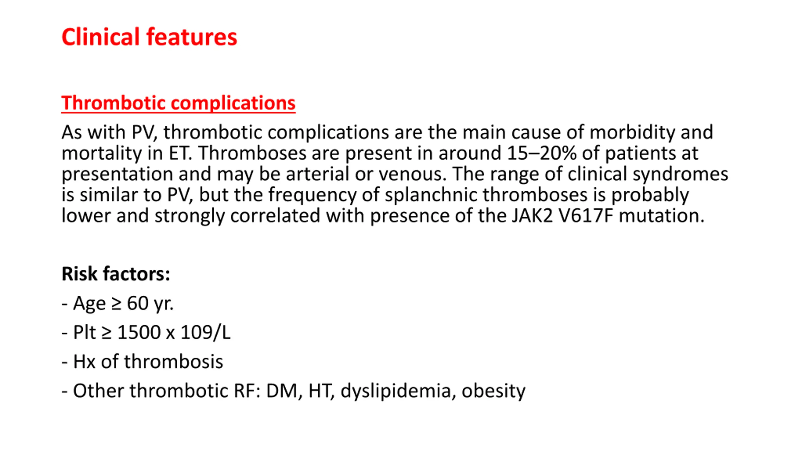 Clinical features Thrombotic complications As with PV, thrombotic complications are the main cause of morbidity and mortality in ET. Thromboses are present in around 15 20% of patients at presentation and may be arterial or venous. The range of clinical syndromes is similar to PV, but the frequency of splanchnic thromboses is probably lower and strongly correlated with presence of the JAK2 V617F mutation. Risk factors: - Age 60 yr. - Plt 1500 x 109/L - Hx of thrombosis - Other thrombotic RF: DM, HT, dyslipidemia, obesity
