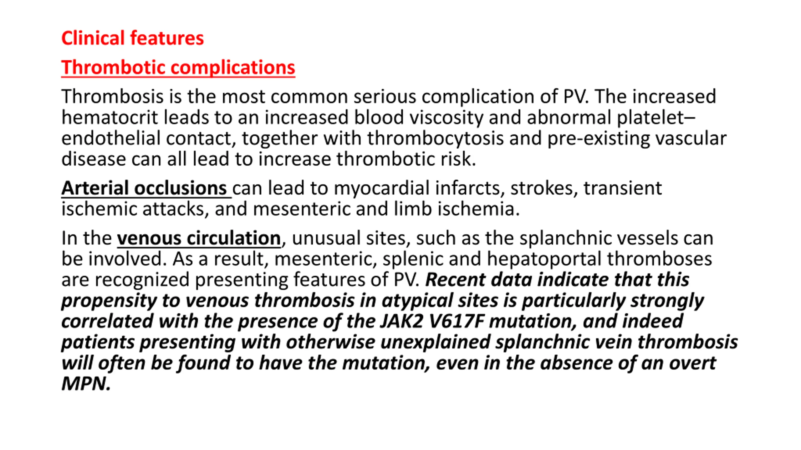 Clinical features Thrombotic complications Thrombosis is the most common serious complication of PV. The increased hematocrit leads to an increased blood viscosity and abnormal platelet endothelial contact, together with thrombocytosis and pre-existing vascular disease can all lead to increase thrombotic risk. Arterial occlusions can lead to myocardial infarcts, strokes, transient ischemic attacks, and mesenteric and limb ischemia. In the venous circulation, unusual sites, such as the splanchnic vessels can be involved. As a result, mesenteric, splenic and hepatoportal thromboses are recognized presenting features of PV. Recent data indicate that this propensity to venous thrombosis in atypical sites is particularly strongly correlated with the presence of the JAK2 V617F mutation, and indeed patients presenting with otherwise unexplained splanchnic vein thrombosis will often be found to have the mutation, even in the absence of an overt MPN.