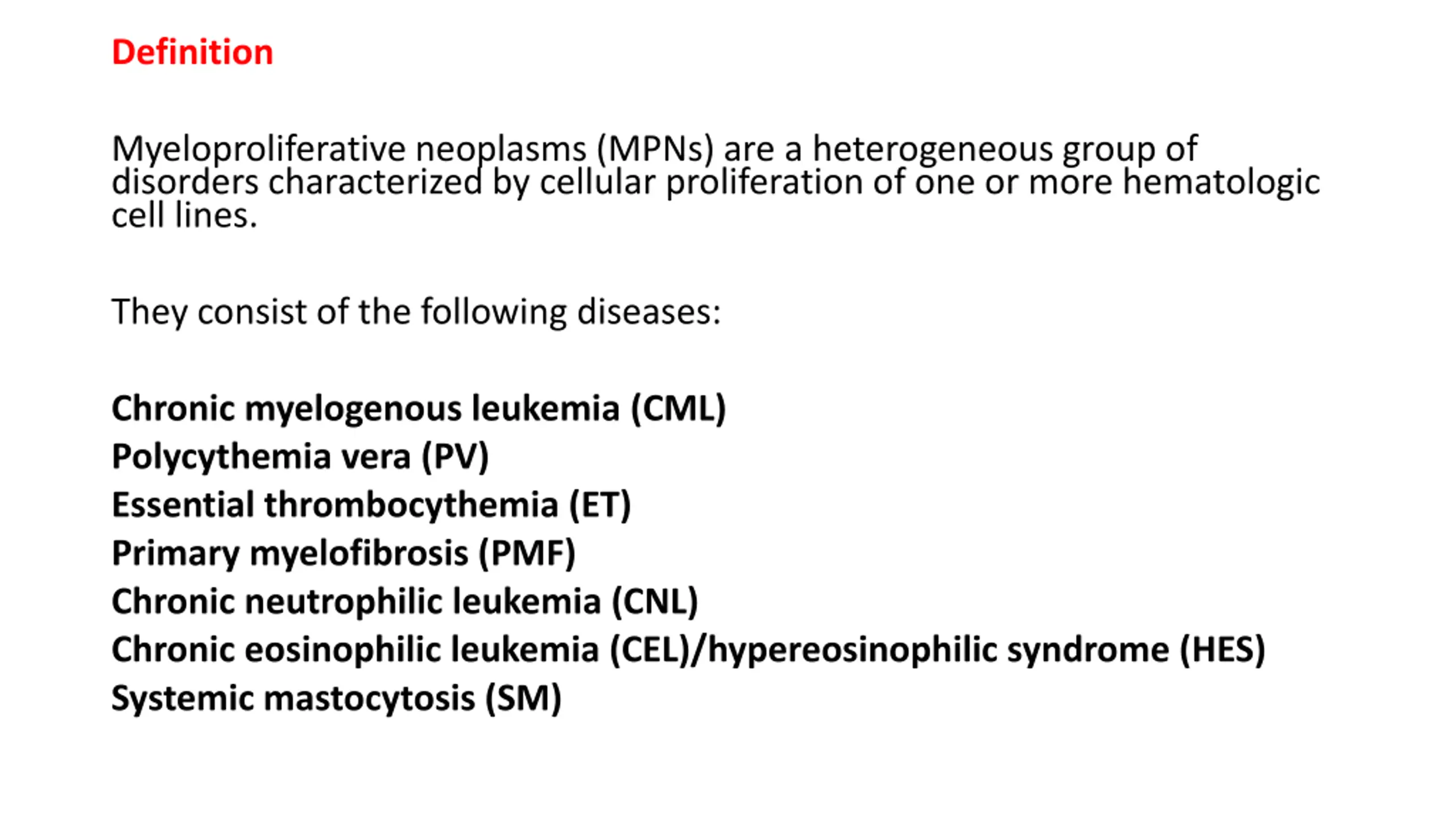 Definition Myeloproliferative neoplasms (MPNs) are a heterogeneous group of disorders characterized by cellular proliferation of one or more hematologic cell lines. They consist of the following diseases: Chronic myelogenous leukemia (CML) Polycythemia vera (PV) Essential thrombocythemia (ET) Primary myelofibrosis (PMF) Chronic neutrophilic leukemia (CNL) Chronic eosinophilic leukemia (CEL)/hypereosinophilic syndrome (HES) Systemic mastocytosis (SM)