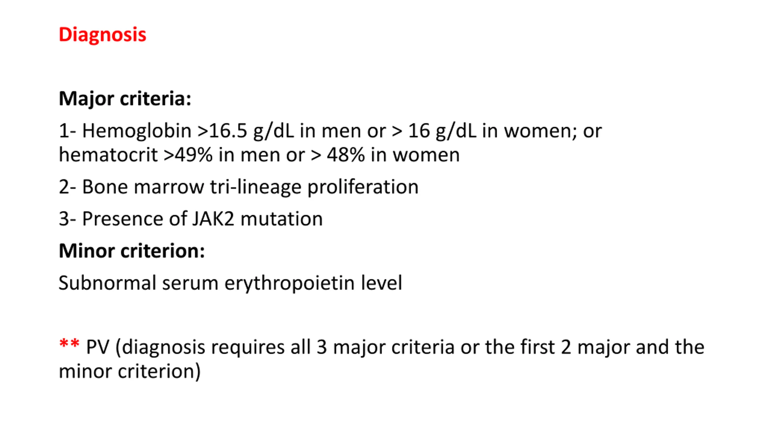 Diagnosis Major criteria: 1- Hemoglobin >16.5 g/dL in men or > 16 g/dL in women; or hematocrit >49% in men or > 48% in women 2- Bone marrow tri lineage proliferation 3- Presence of JAK2 mutation Minor criterion: Subnormal serum erythropoietin level ** PV (diagnosis requires all 3 major criteria or the first 2 major and the minor criterion)