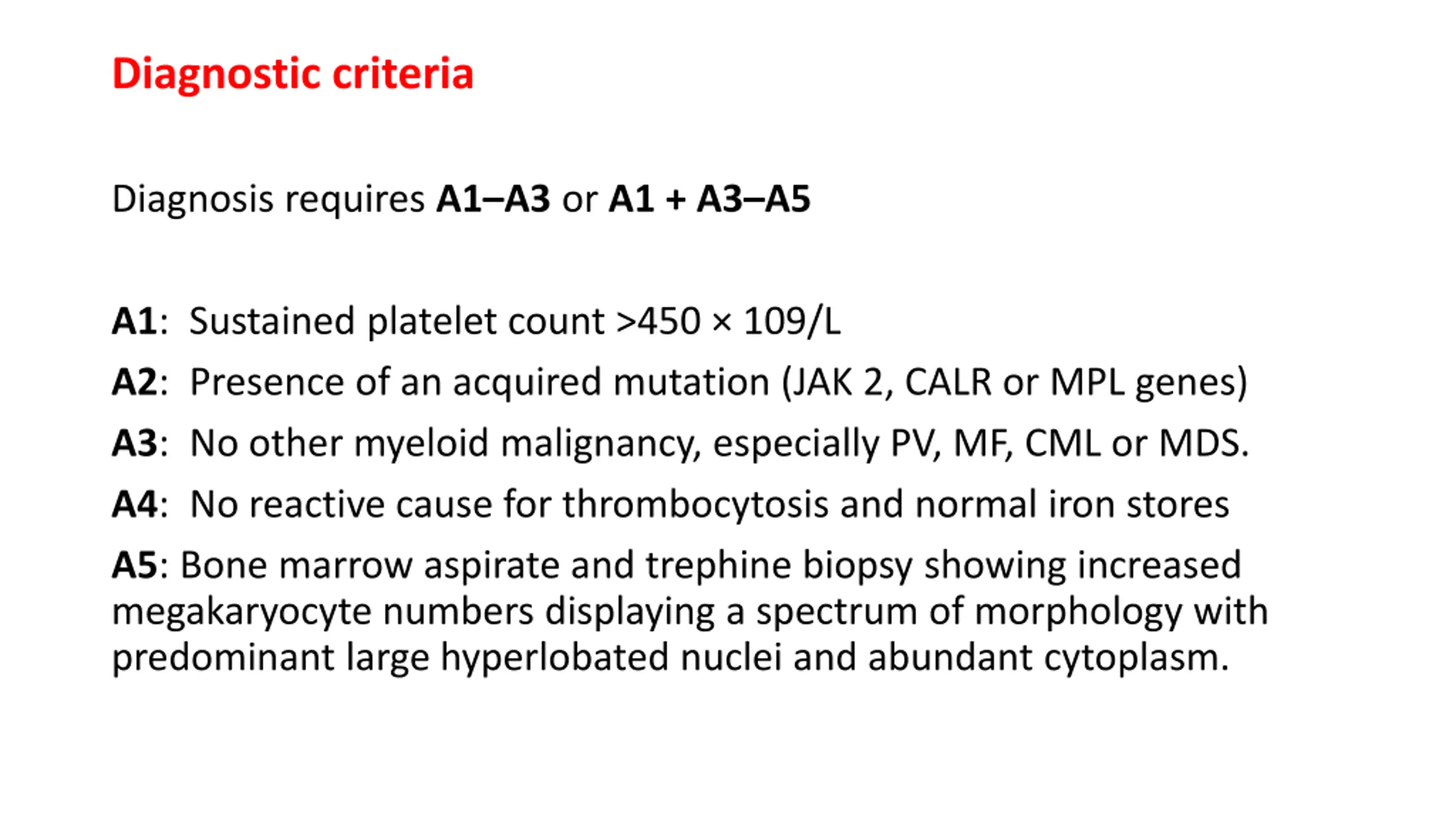 Diagnostic criteria Diagnosis requires A1 A3 or A1 + A3 A5 A1: Sustained platelet count >450 109/L A2: Presence of an acquired mutation (JAK 2, CALR or MPL genes) A3: No other myeloid malignancy, especially PV, MF, CML or MDS. A4: No reactive cause for thrombocytosis and normal iron stores A5: Bone marrow aspirate and trephine biopsy showing increased megakaryocyte numbers displaying a spectrum of morphology with predominant large hyperlobated nuclei and abundant cytoplasm.