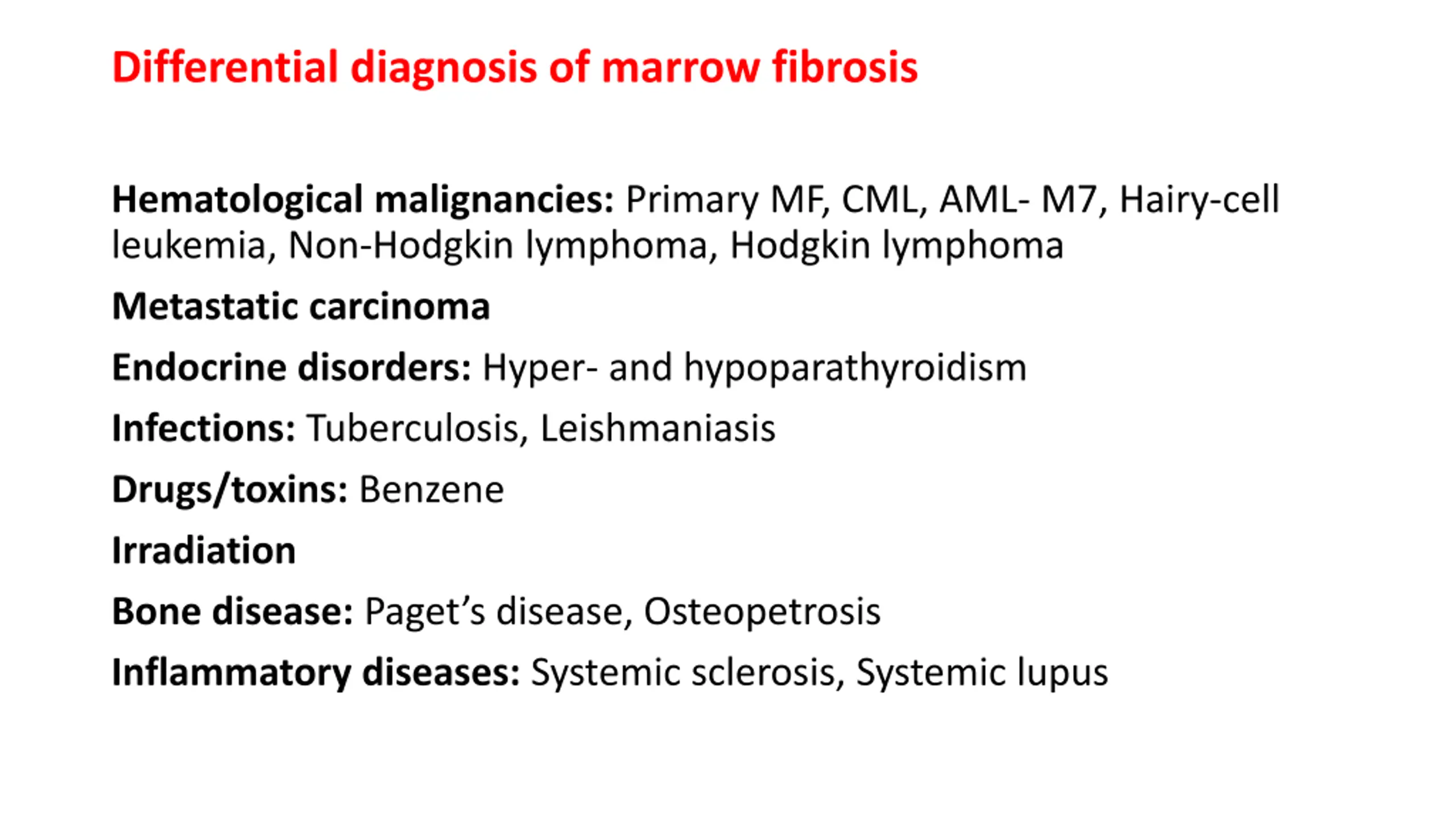 Differential diagnosis of marrow fibrosis Hematological malignancies: Primary MF, CML, AML- M7, Hairy-cell leukemia, Non-Hodgkin lymphoma, Hodgkin lymphoma Metastatic carcinoma Endocrine disorders: Hyper- and hypoparathyroidism Infections: Tuberculosis, Leishmaniasis Drugs/toxins: Benzene Irradiation Bone disease: Paget s disease, Osteopetrosis Inflammatory diseases: Systemic sclerosis, Systemic lupus