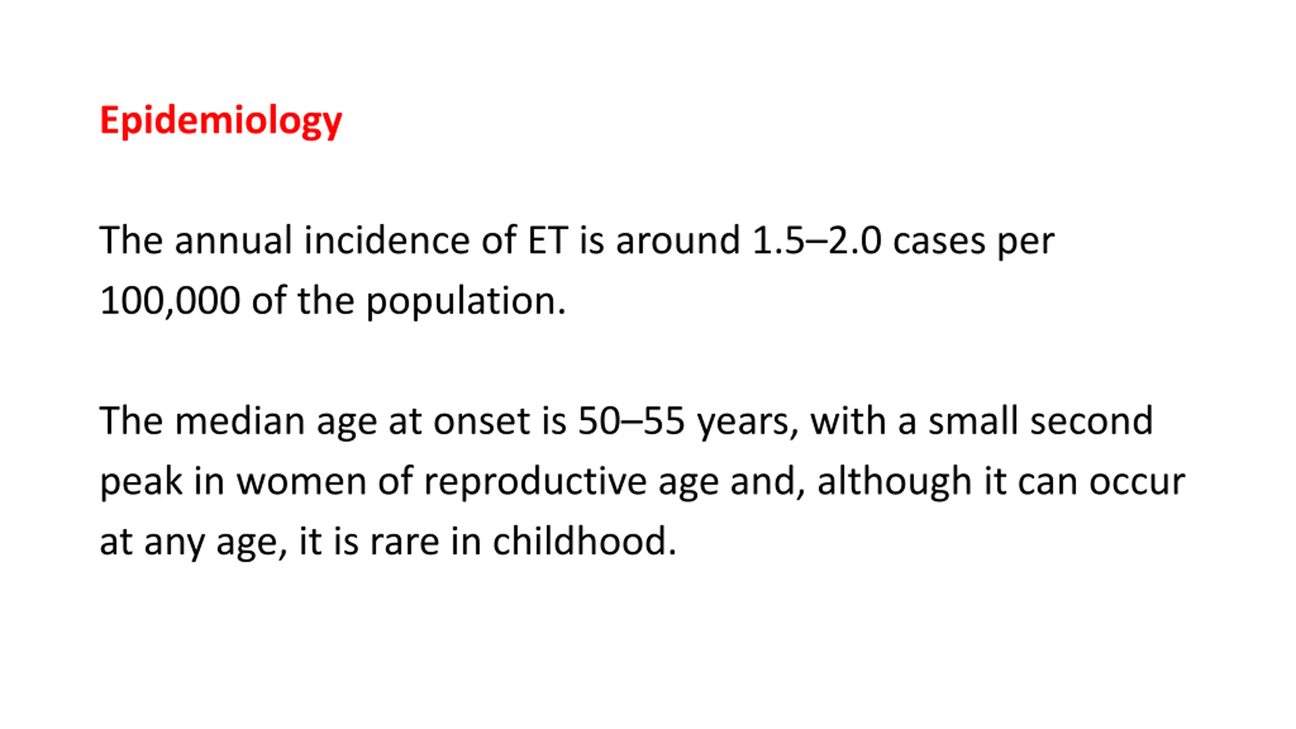 Epidemiology The annual incidence of ET is around 1.5 2.0 cases per 100,000 of the population. The median age at onset is 50 55 years, with a small second peak in women of reproductive age and, although it can occur at any age, it is rare in childhood.