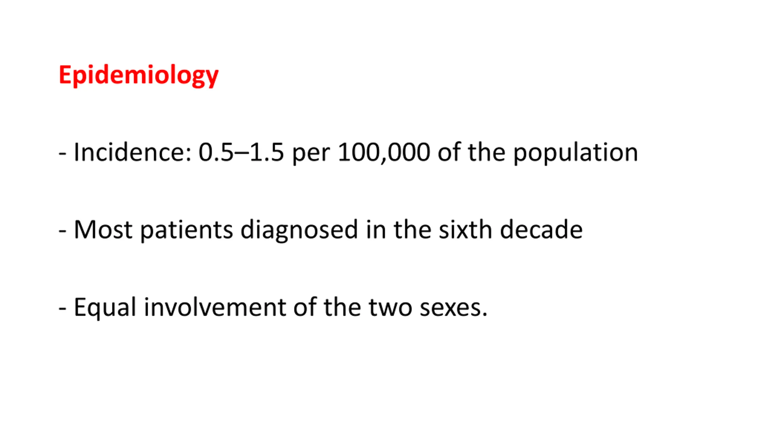 Epidemiology - Incidence: 0.5 1.5 per 100,000 of the population - Most patients diagnosed in the sixth decade - Equal involvement of the two sexes.