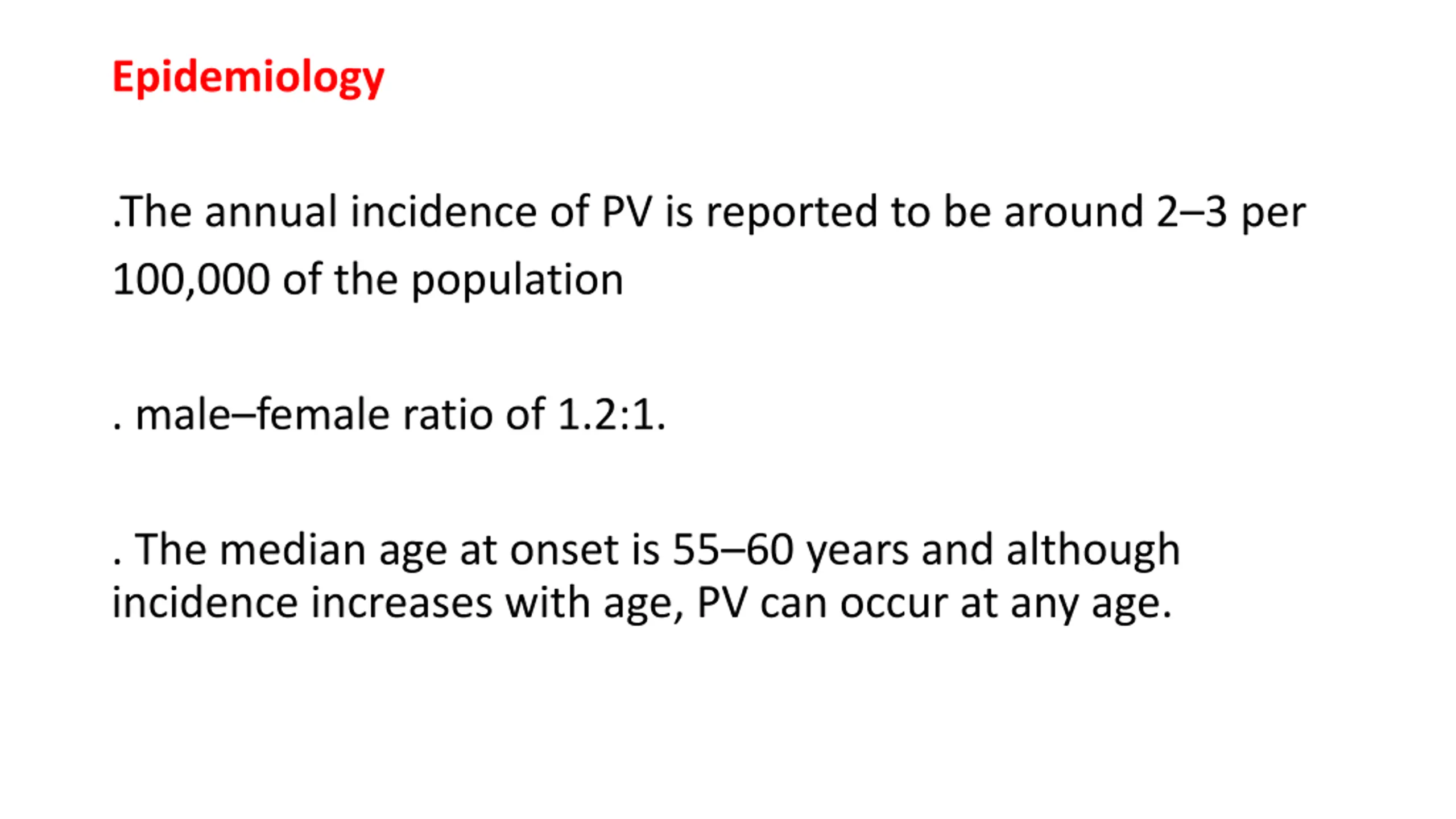 Epidemiology .The annual incidence of PV is reported to be around 2 3 per 100,000 of the population . male female ratio of 1.2:1. . The median age at onset is 55 60 years and although incidence increases with age, PV can occur at any age.
