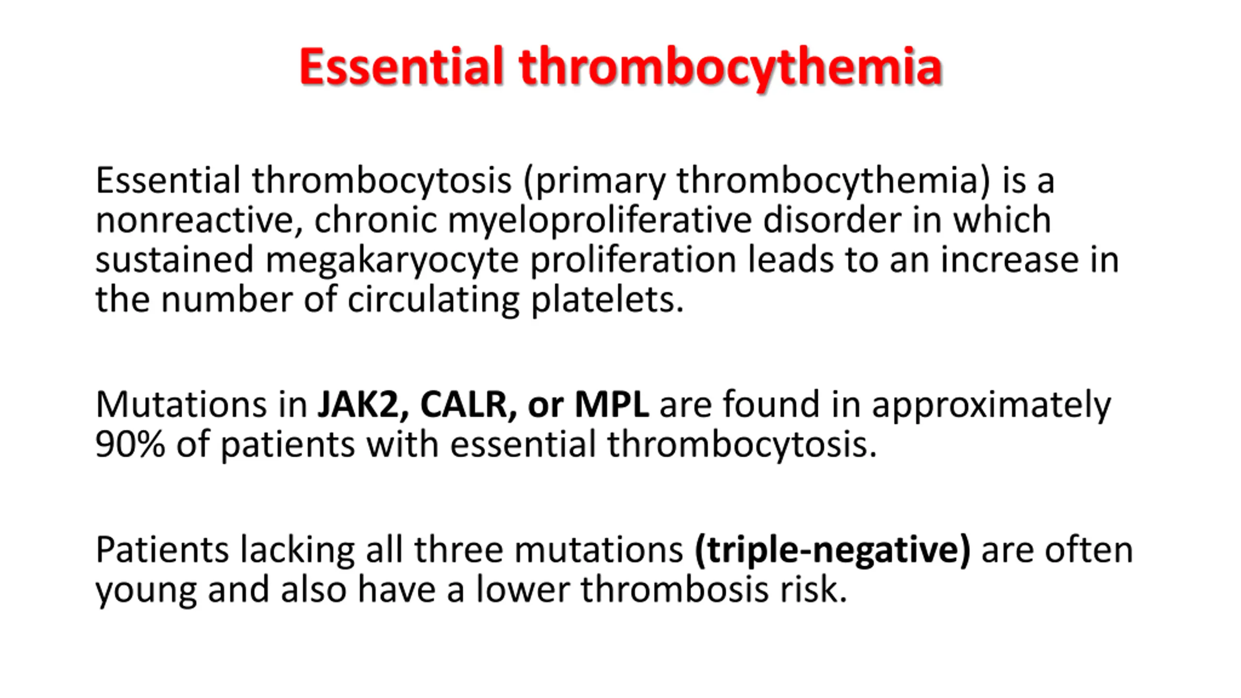 Essential thrombocythemia Essential thrombocytosis (primary thrombocythemia) is a nonreactive, chronic myeloproliferative disorder in which sustained megakaryocyte proliferation leads to an increase in the number of circulating platelets. Mutations in JAK2, CALR, or MPL are found in approximately 90% of patients with essential thrombocytosis. Patients lacking all three mutations (triple-negative) are often young and also have a lower thrombosis risk.