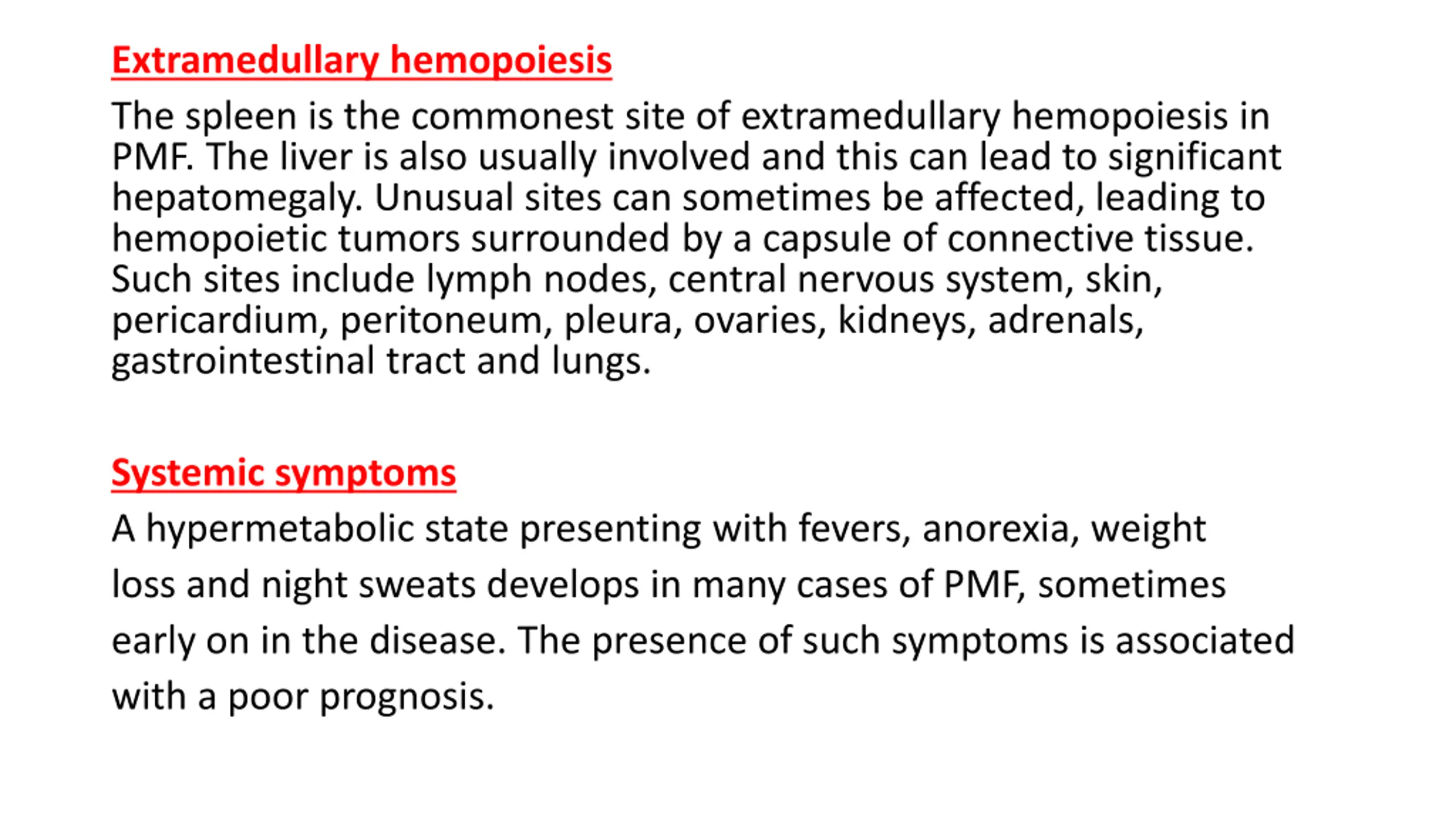 Extramedullary hemopoiesis The spleen is the commonest site of extramedullary hemopoiesis in PMF. The liver is also usually involved and this can lead to significant hepatomegaly. Unusual sites can sometimes be affected, leading to hemopoietic tumors surrounded by a capsule of connective tissue. Such sites include lymph nodes, central nervous system, skin, pericardium, peritoneum, pleura, ovaries, kidneys, adrenals, gastrointestinal tract and lungs. Systemic symptoms A hypermetabolic state presenting with fevers, anorexia, weight loss and night sweats develops in many cases of PMF, sometimes early on in the disease. The presence of such symptoms is associated with a poor prognosis.