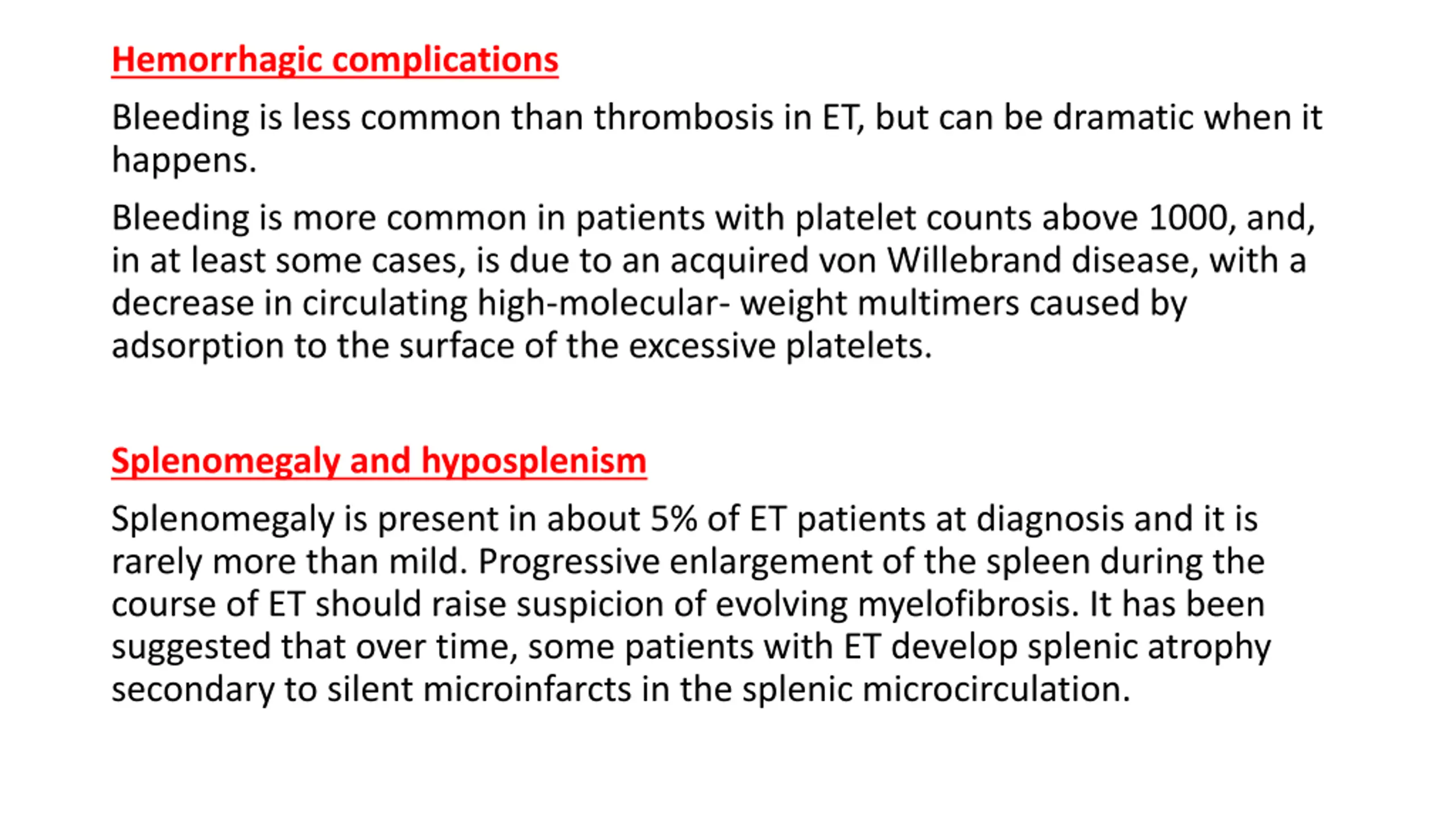Hemorrhagic complications Bleeding is less common than thrombosis in ET, but can be dramatic when it happens. Bleeding is more common in patients with platelet counts above 1000, and, in at least some cases, is due to an acquired von Willebrand disease, with a decrease in circulating high-molecular- weight multimers caused by adsorption to the surface of the excessive platelets. Splenomegaly and hyposplenism Splenomegaly is present in about 5% of ET patients at diagnosis and it is rarely more than mild. Progressive enlargement of the spleen during the course of ET should raise suspicion of evolving myelofibrosis. It has been suggested that over time, some patients with ET develop splenic atrophy secondary to silent microinfarcts in the splenic microcirculation.