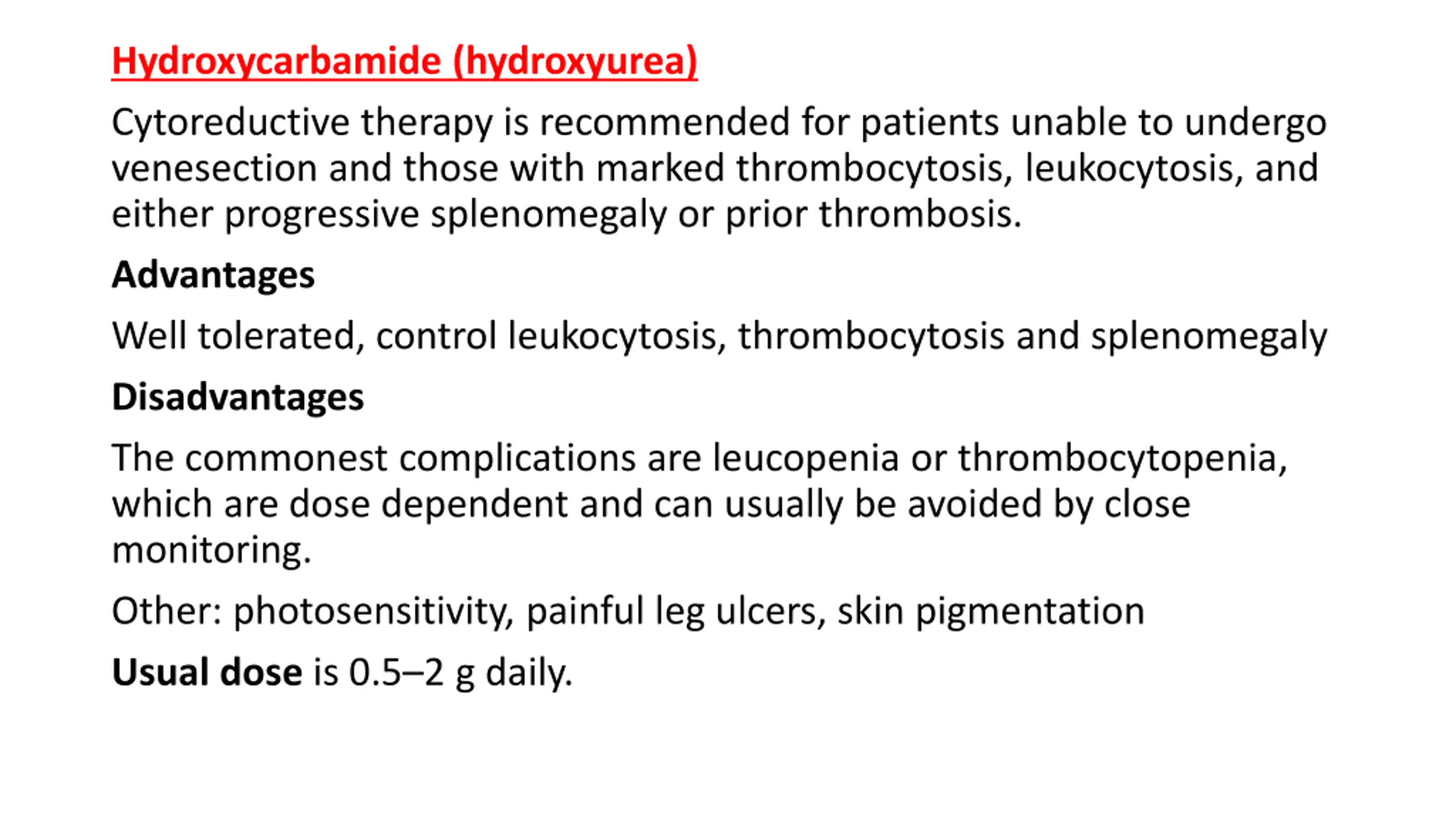Hydroxycarbamide (hydroxyurea) Cytoreductive therapy is recommended for patients unable to undergo venesection and those with marked thrombocytosis, leukocytosis, and either progressive splenomegaly or prior thrombosis. Advantages Well tolerated, control leukocytosis, thrombocytosis and splenomegaly Disadvantages The commonest complications are leucopenia or thrombocytopenia, which are dose dependent and can usually be avoided by close monitoring. Other: photosensitivity, painful leg ulcers, skin pigmentation Usual dose is 0.5 2 g daily.