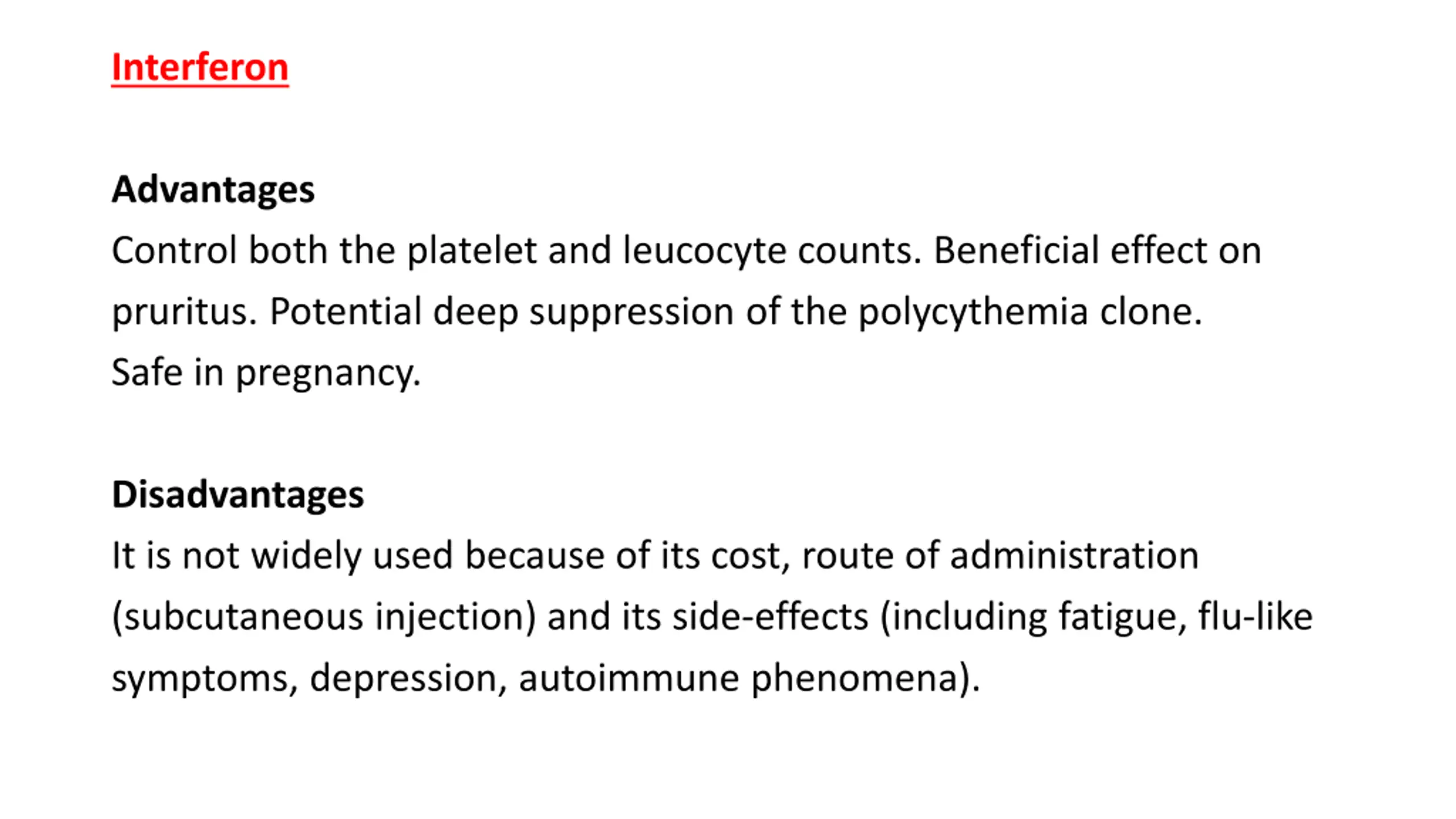 Interferon Advantages Control both the platelet and leucocyte counts. Beneficial effect on pruritus. Potential deep suppression of the polycythemia clone. Safe in pregnancy. Disadvantages It is not widely used because of its cost, route of administration (subcutaneous injection) and its side-effects (including fatigue, flu-like symptoms, depression, autoimmune phenomena).