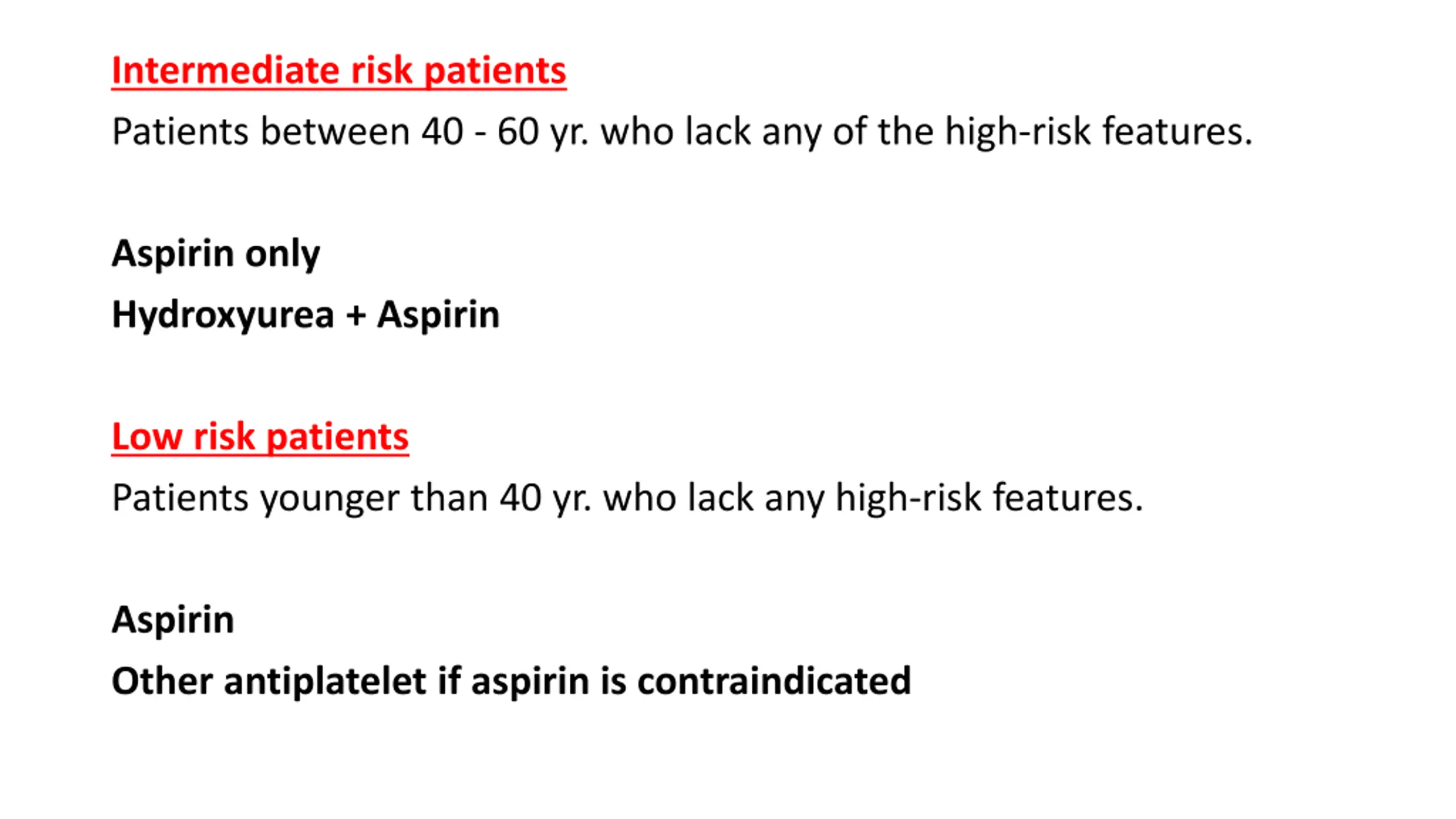 Intermediate risk patients Patients between 40 - 60 yr. who lack any of the high-risk features. Aspirin only Hydroxyurea + Aspirin Low risk patients Patients younger than 40 yr. who lack any high-risk features. Aspirin Other antiplatelet if aspirin is contraindicated