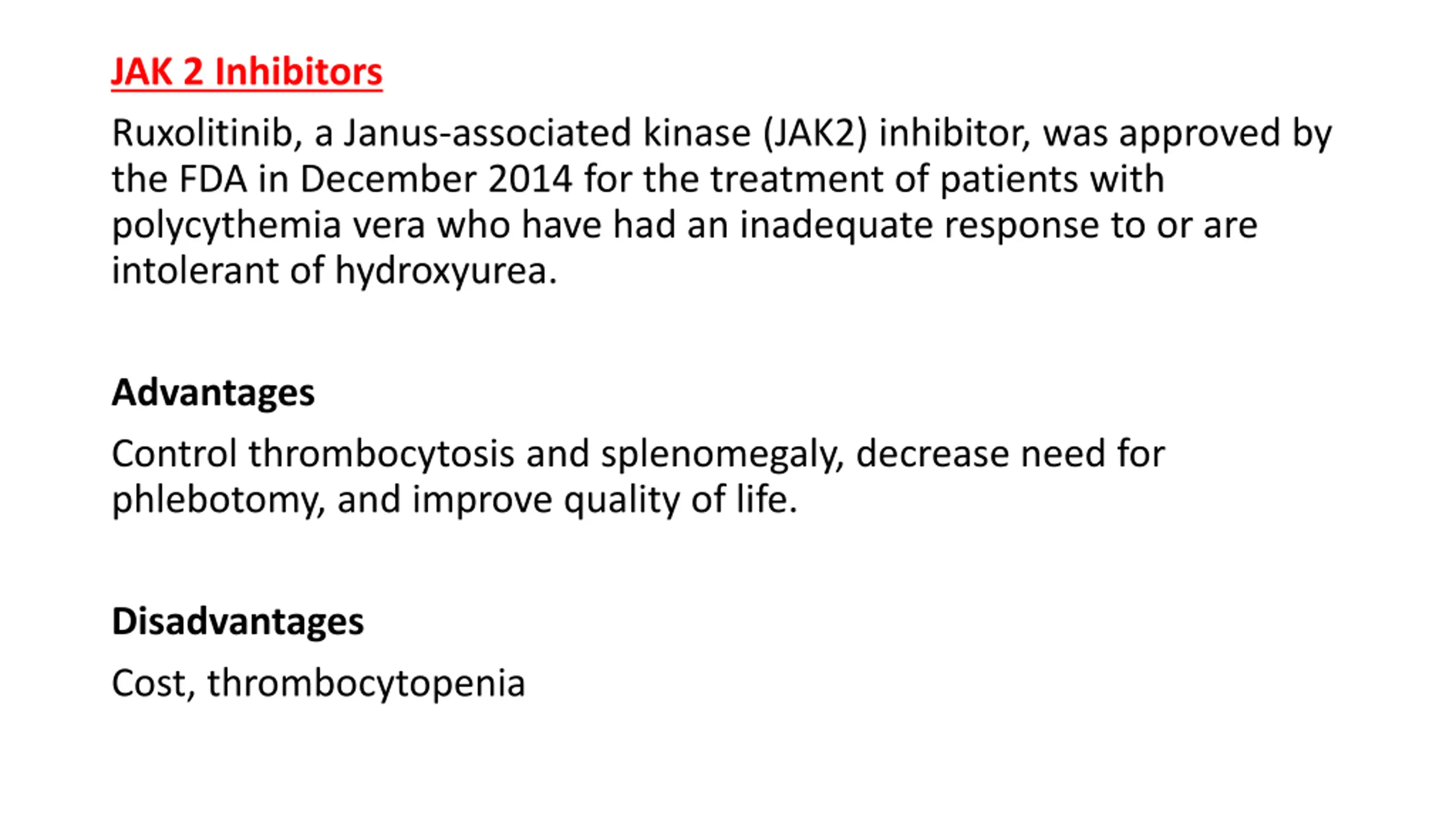 JAK 2 Inhibitors Ruxolitinib, a Janus-associated kinase (JAK2) inhibitor, was approved by the FDA in December 2014 for the treatment of patients with polycythemia vera who have had an inadequate response to or are intolerant of hydroxyurea. Advantages Control thrombocytosis and splenomegaly, decrease need for phlebotomy, and improve quality of life. Disadvantages Cost, thrombocytopenia
