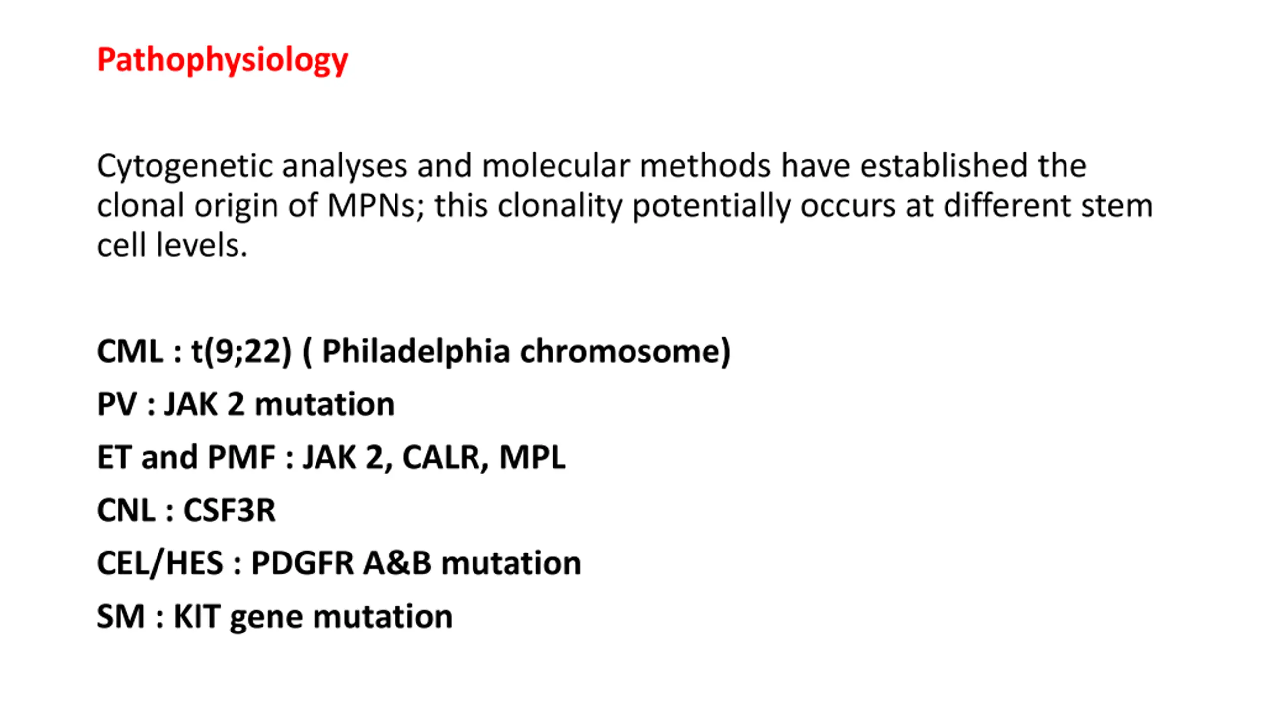 Pathophysiology Cytogenetic analyses and molecular methods have established the clonal origin of MPNs; this clonality potentially occurs at different stem cell levels. CML : t(9;22) ( Philadelphia chromosome) PV : JAK 2 mutation ET and PMF : JAK 2, CALR, MPL CNL : CSF3R CEL/HES : PDGFR A&B mutation SM : KIT gene mutation