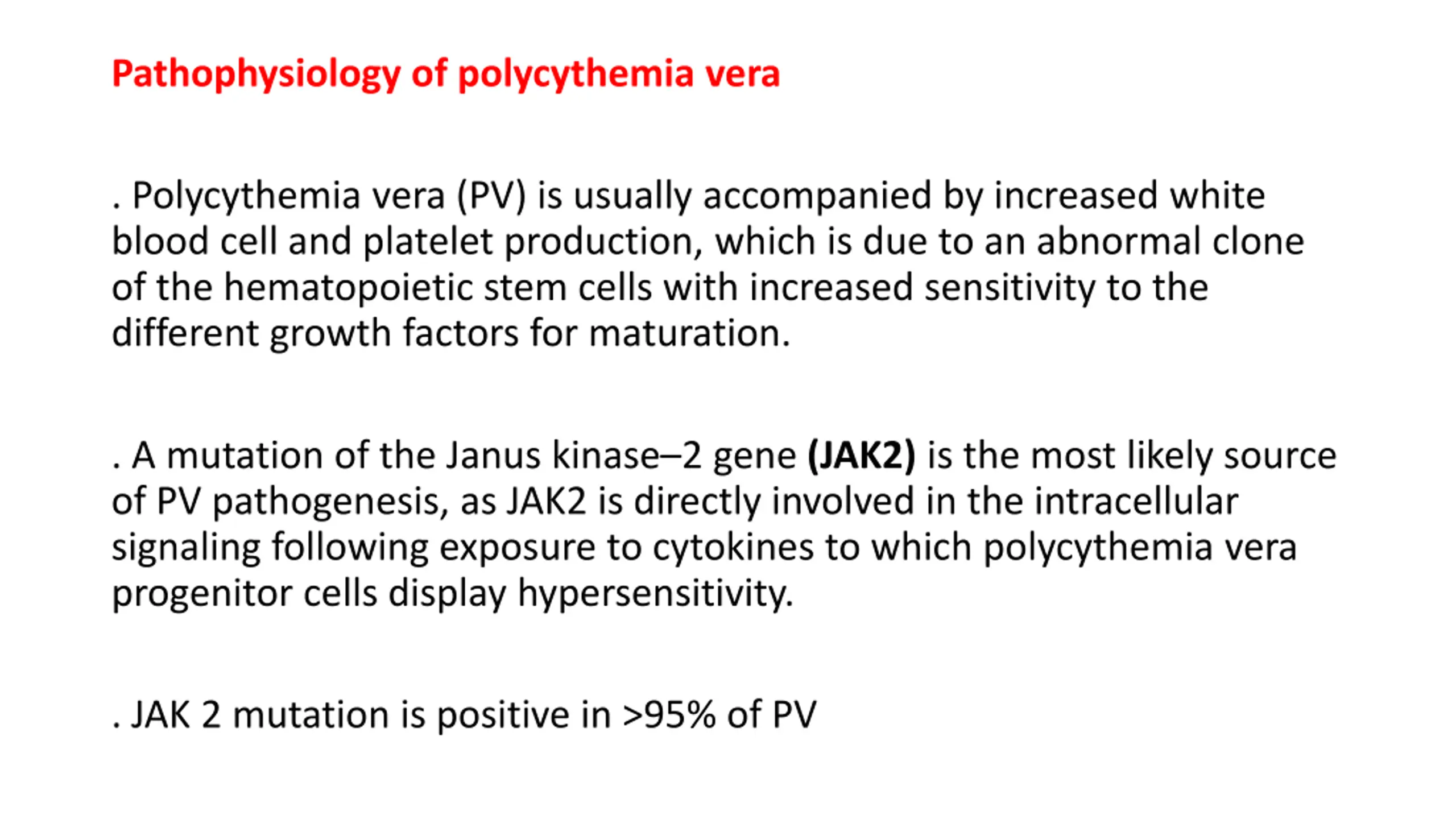 Pathophysiology of polycythemia vera . Polycythemia vera (PV) is usually accompanied by increased white blood cell and platelet production, which is due to an abnormal clone of the hematopoietic stem cells with increased sensitivity to the different growth factors for maturation. . A mutation of the Janus kinase 2 gene (JAK2) is the most likely source of PV pathogenesis, as JAK2 is directly involved in the intracellular signaling following exposure to cytokines to which polycythemia vera progenitor cells display hypersensitivity. . JAK 2 mutation is positive in >95% of PV