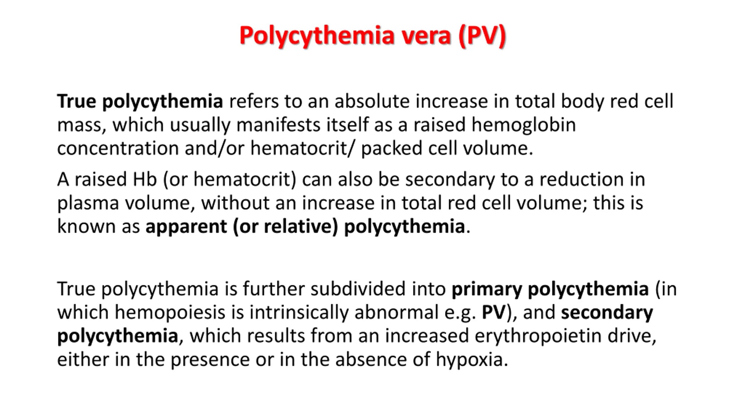Polycythemia vera (PV) True polycythemia refers to an absolute increase in total body red cell mass, which usually manifests itself as a raised hemoglobin concentration and/or hematocrit/ packed cell volume. A raised Hb (or hematocrit) can also be secondary to a reduction in plasma volume, without an increase in total red cell volume; this is known as apparent (or relative) polycythemia. True polycythemia is further subdivided into primary polycythemia (in which hemopoiesis is intrinsically abnormal e.g. PV), and secondary polycythemia, which results from an increased erythropoietin drive, either in the presence or in the absence of hypoxia.