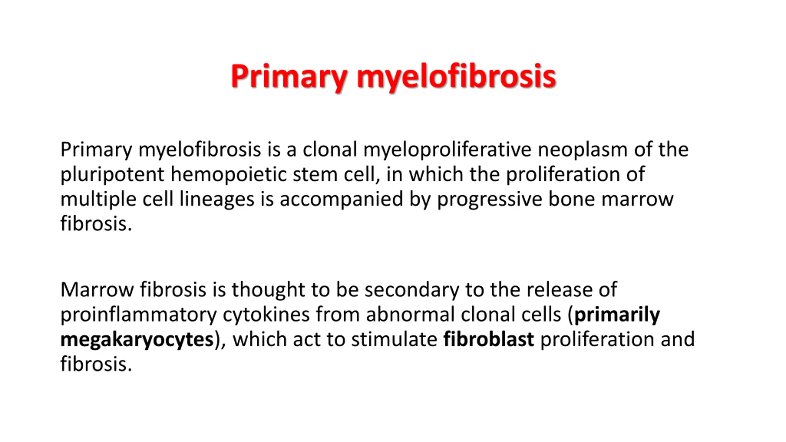 Primary myelofibrosis Primary myelofibrosis is a clonal myeloproliferative neoplasm of the pluripotent hemopoietic stem cell, in which the proliferation of multiple cell lineages is accompanied by progressive bone marrow fibrosis. Marrow fibrosis is thought to be secondary to the release of proinflammatory cytokines from abnormal clonal cells (primarily megakaryocytes), which act to stimulate fibroblast proliferation and fibrosis.