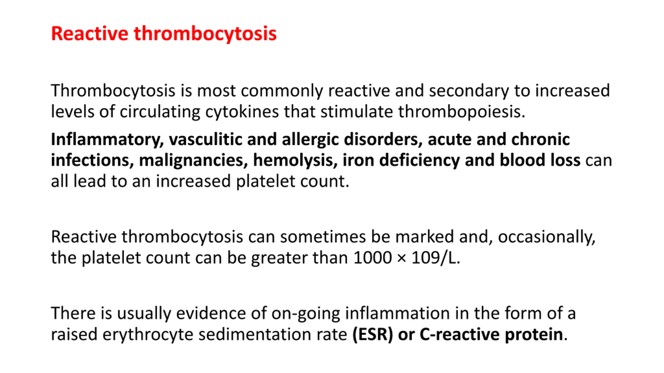 Reactive thrombocytosis Thrombocytosis is most commonly reactive and secondary to increased levels of circulating cytokines that stimulate thrombopoiesis. Inflammatory, vasculitic and allergic disorders, acute and chronic infections, malignancies, hemolysis, iron deficiency and blood loss can all lead to an increased platelet count. Reactive thrombocytosis can sometimes be marked and, occasionally, the platelet count can be greater than 1000 109/L. There is usually evidence of on-going inflammation in the form of a raised erythrocyte sedimentation rate (ESR) or C-reactive protein.
