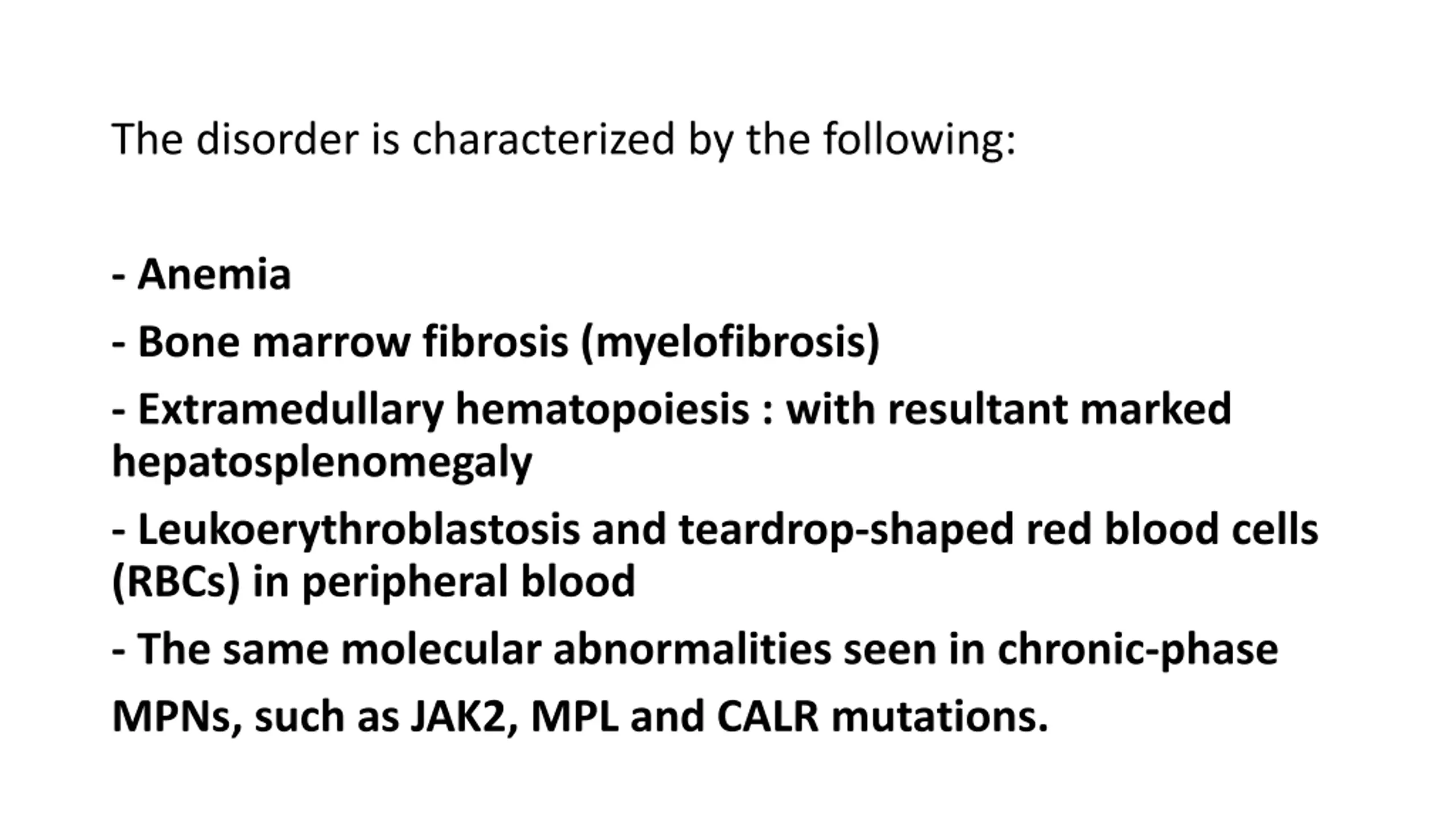 The disorder is characterized by the following: - Anemia - Bone marrow fibrosis (myelofibrosis) - Extramedullary hematopoiesis : with resultant marked hepatosplenomegaly - Leukoerythroblastosis and teardrop-shaped red blood cells (RBCs) in peripheral blood - The same molecular abnormalities seen in chronic-phase MPNs, such as JAK2, MPL and CALR mutations.