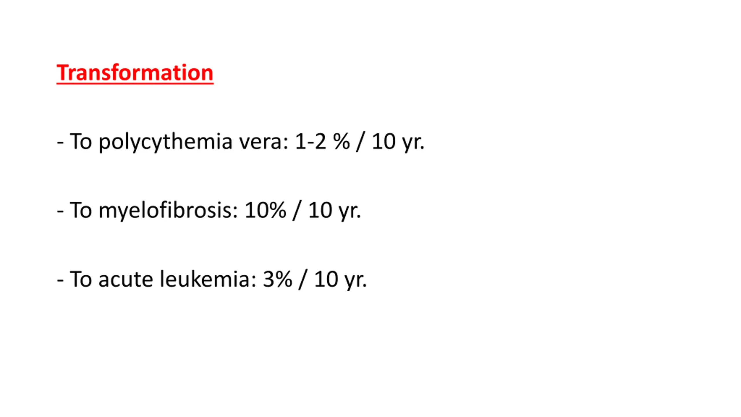 Transformation - To polycythemia vera: 1-2 % / 10 yr. - To myelofibrosis: 10% / 10 yr. - To acute leukemia: 3% / 10 yr.