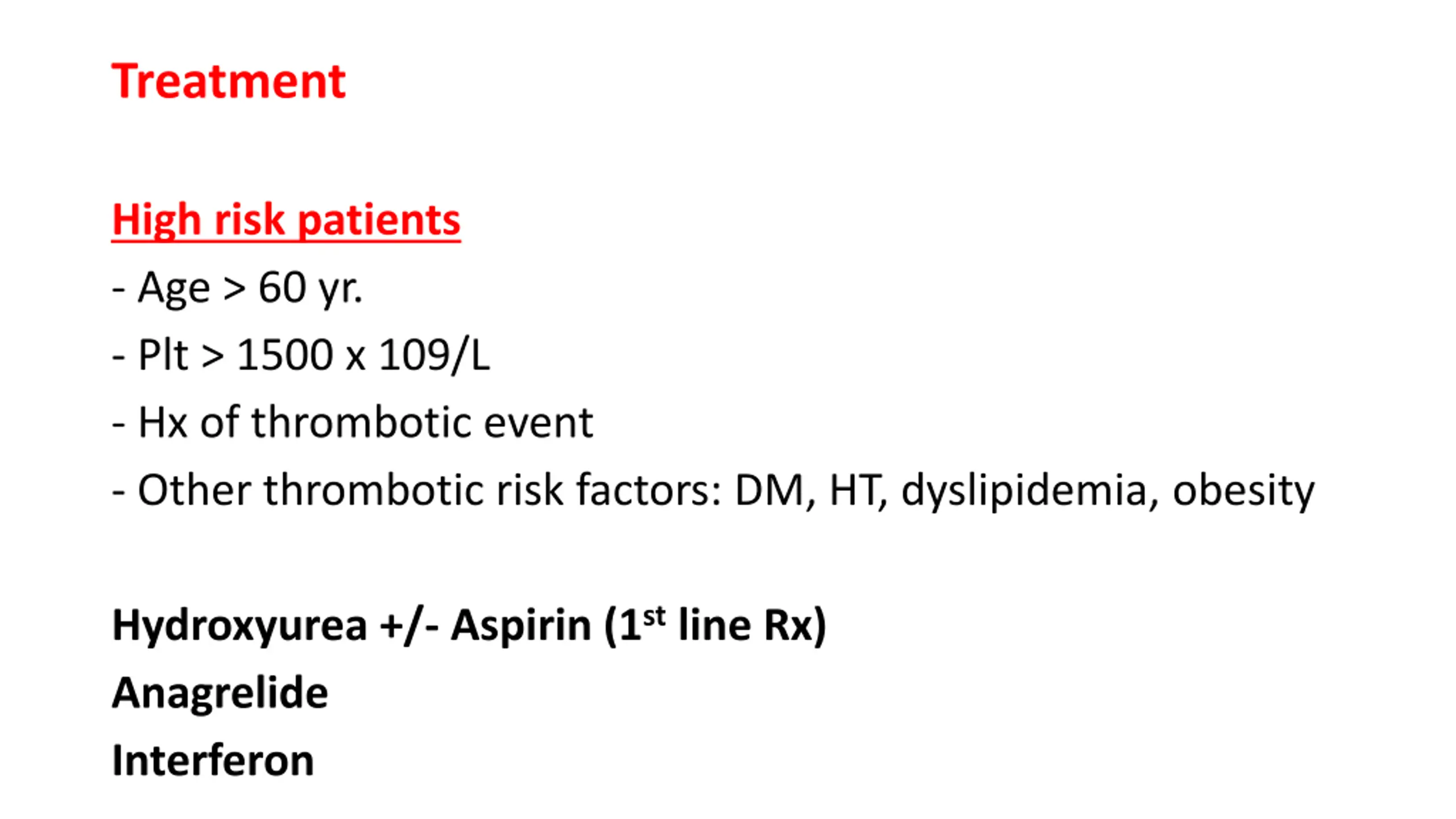 Treatment High risk patients - Age > 60 yr. - Plt > 1500 x 109/L - Hx of thrombotic event - Other thrombotic risk factors: DM, HT, dyslipidemia, obesity Hydroxyurea +/- Aspirin (1stline Rx) Anagrelide Interferon