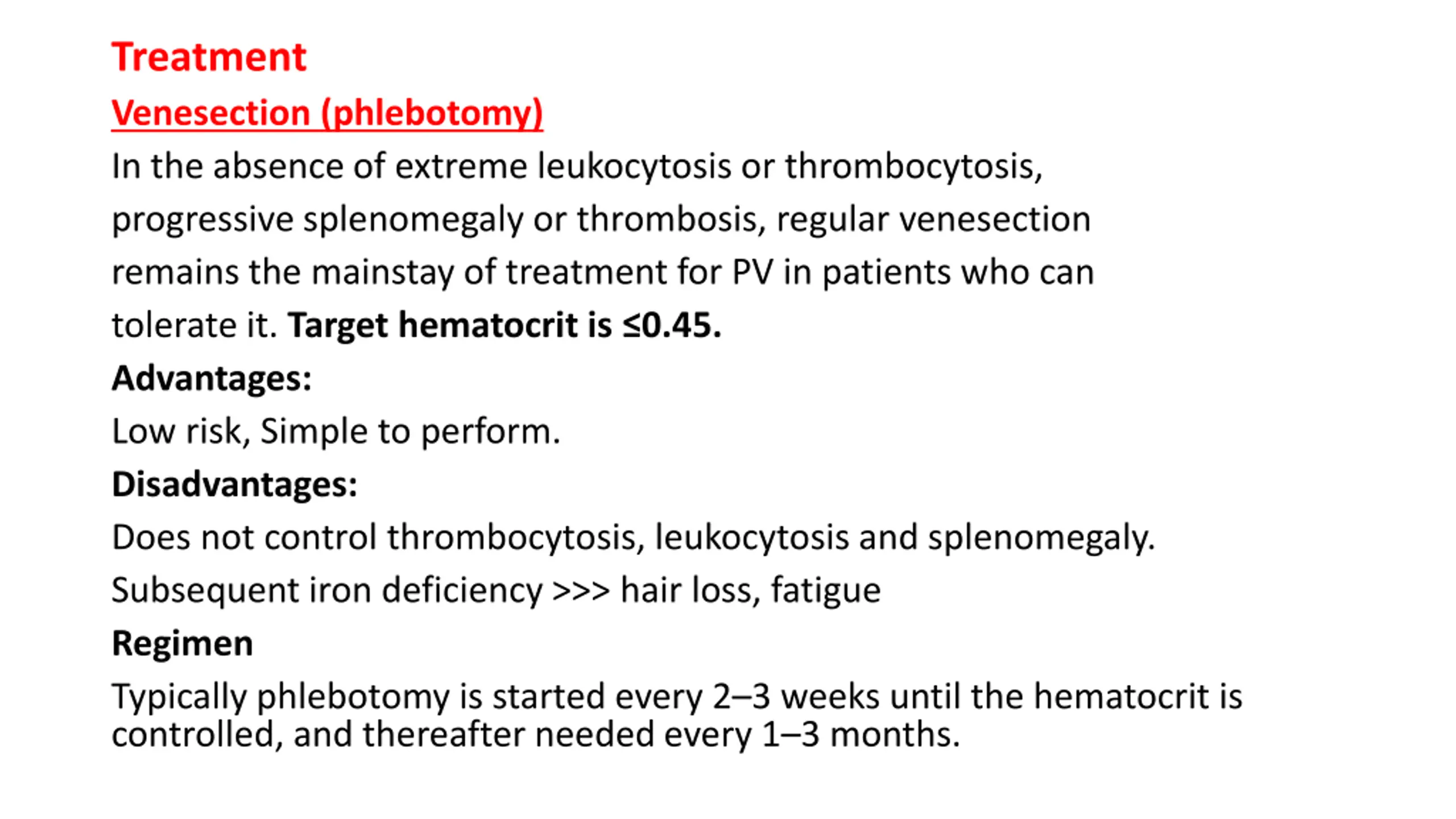 Treatment Venesection (phlebotomy) In the absence of extreme leukocytosis or thrombocytosis, progressive splenomegaly or thrombosis, regular venesection remains the mainstay of treatment for PV in patients who can tolerate it. Target hematocrit is 0.45. Advantages: Low risk, Simple to perform. Disadvantages: Does not control thrombocytosis, leukocytosis and splenomegaly. Subsequent iron deficiency >>> hair loss, fatigue Regimen Typically phlebotomy is started every 2 3 weeks until the hematocrit is controlled, and thereafter needed every 1 3 months.