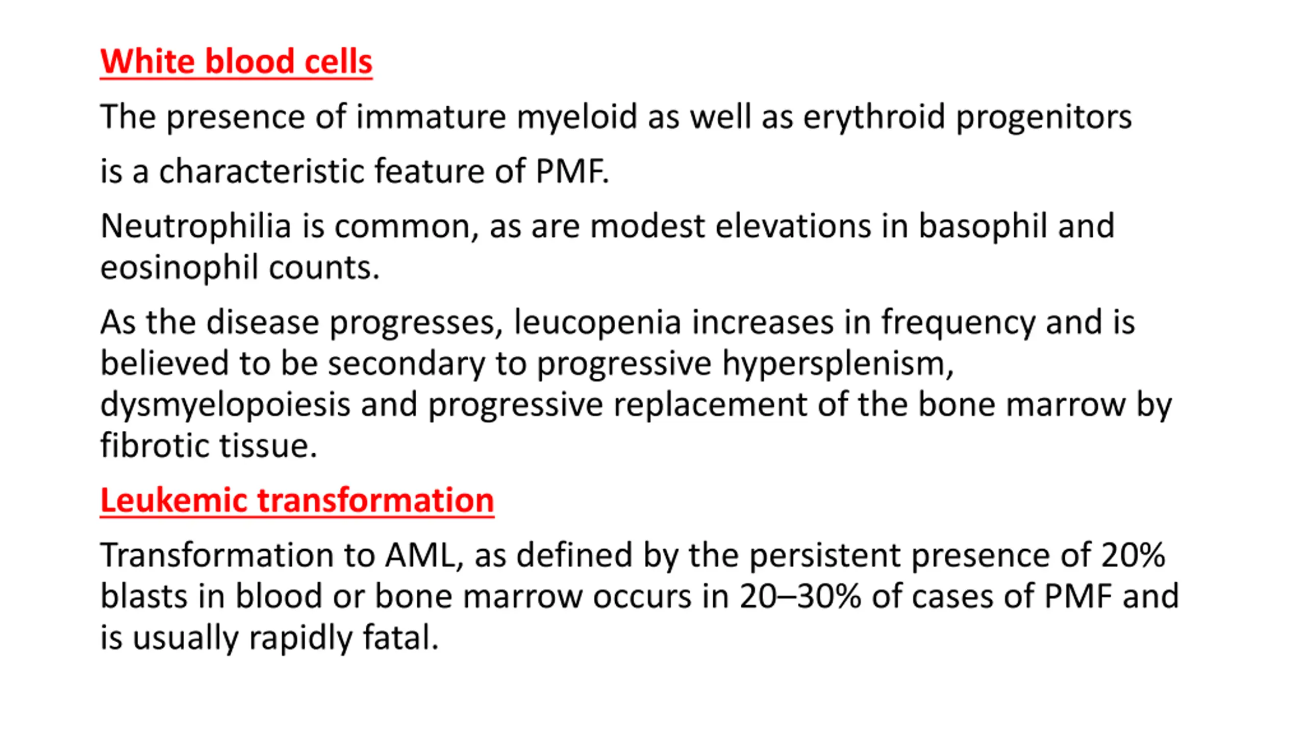 White blood cells The presence of immature myeloid as well as erythroid progenitors is a characteristic feature of PMF. Neutrophilia is common, as are modest elevations in basophil and eosinophil counts. As the disease progresses, leucopenia increases in frequency and is believed to be secondary to progressive hypersplenism, dysmyelopoiesis and progressive replacement of the bone marrow by fibrotic tissue. Leukemic transformation Transformation to AML, as defined by the persistent presence of 20% blasts in blood or bone marrow occurs in 20 30% of cases of PMF and is usually rapidly fatal.