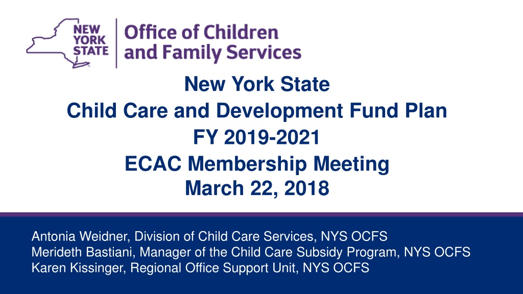 New York State Child Care and Development Fund Plan FY 2019-2021 ECAC Membership Meeting March 22, 2018 March 21, 2025 Antonia Weidner, Division of Child Care Services, NYS OCFS Merideth Bastiani, Manager of the Child Care Subsidy Program, NYS OCFS Karen Kissinger, Regional Office Support Unit, NYS OCFS