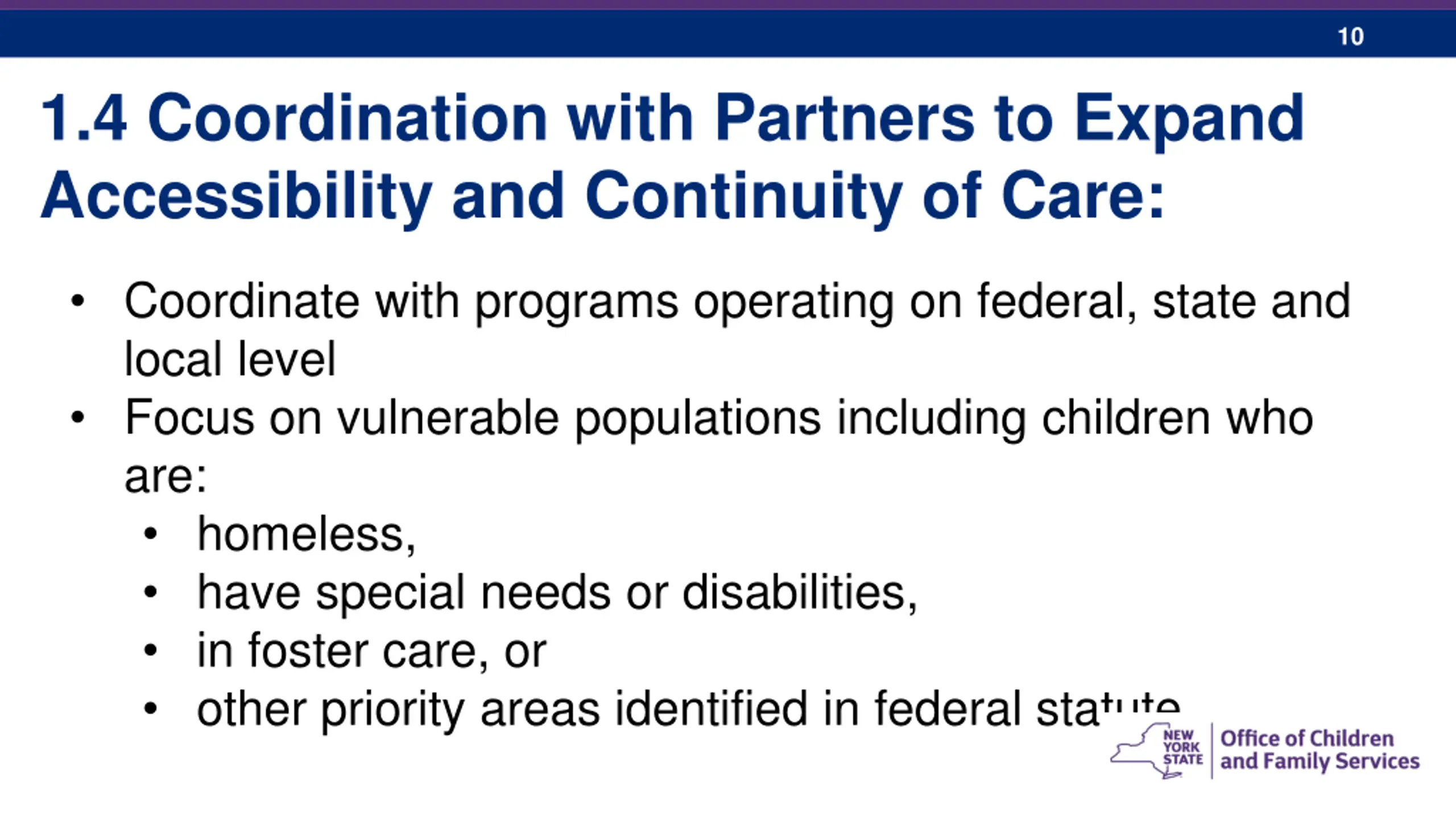 March 21, 2025 1.4 Coordination with Partners to Expand Accessibility and Continuity of Care: 10 Coordinate with programs operating on federal, state and local level Focus on vulnerable populations including children who are: homeless, have special needs or disabilities, in foster care, or other priority areas identified in federal statute