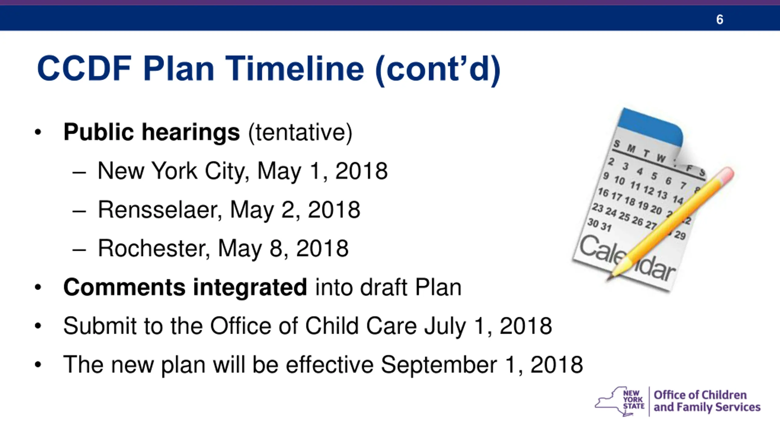 March 21, 2025 6 CCDF Plan Timeline (cont d) Public hearings (tentative) New York City, May 1, 2018 Rensselaer, May 2, 2018 Rochester, May 8, 2018 Comments integrated into draft Plan Submit to the Office of Child Care July 1, 2018 The new plan will be effective September 1, 2018