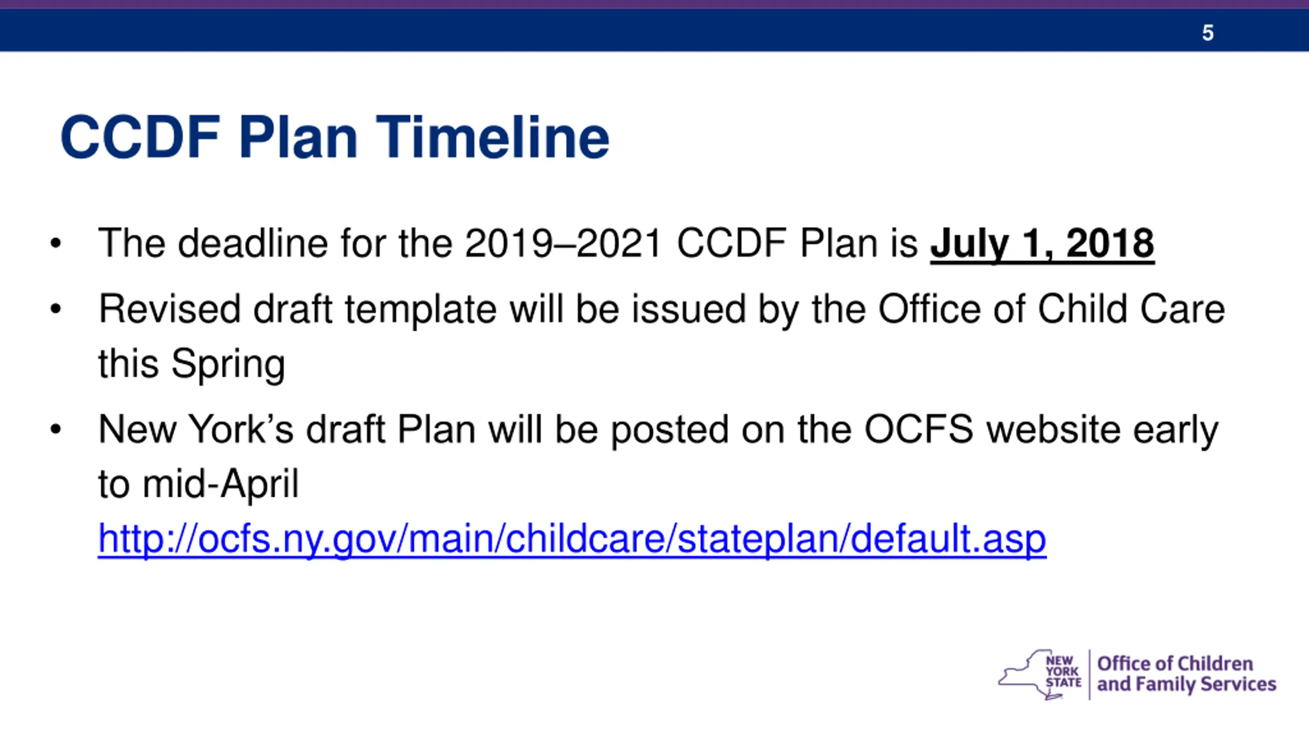 March 21, 2025 5 CCDF Plan Timeline The deadline for the 2019 2021 CCDF Plan is July 1, 2018 Revised draft template will be issued by the Office of Child Care this Spring New York s draft Plan will be posted on the OCFS website early to mid-April http://ocfs.ny.gov/main/childcare/stateplan/default.asp