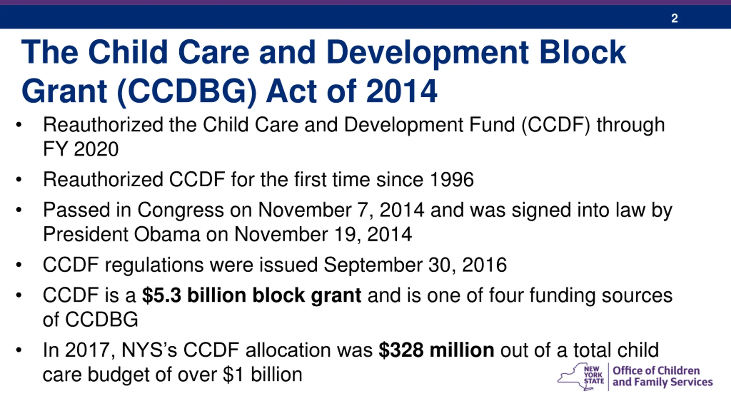 March 21, 2025 The Child Care and Development Block Grant (CCDBG) Act of 2014 Reauthorized the Child Care and Development Fund (CCDF) through FY 2020 Reauthorized CCDF for the first time since 1996 Passed in Congress on November 7, 2014 and was signed into law by President Obama on November 19, 2014 CCDF regulations were issued September 30, 2016 CCDF is a $5.3 billion block grant and is one of four funding sources of CCDBG In 2017, NYS s CCDF allocation was $328 million out of a total child care budget of over $1 billion 2