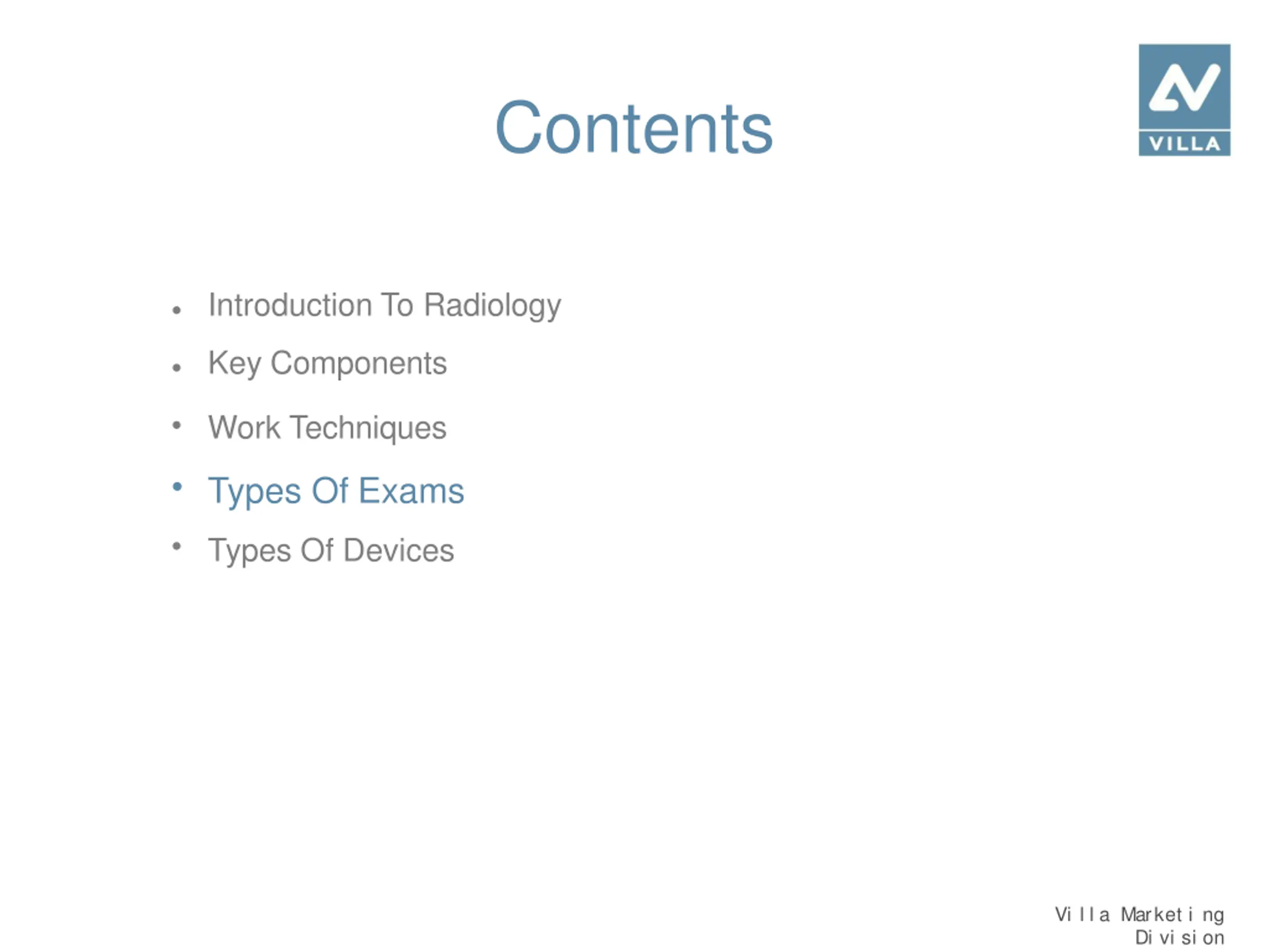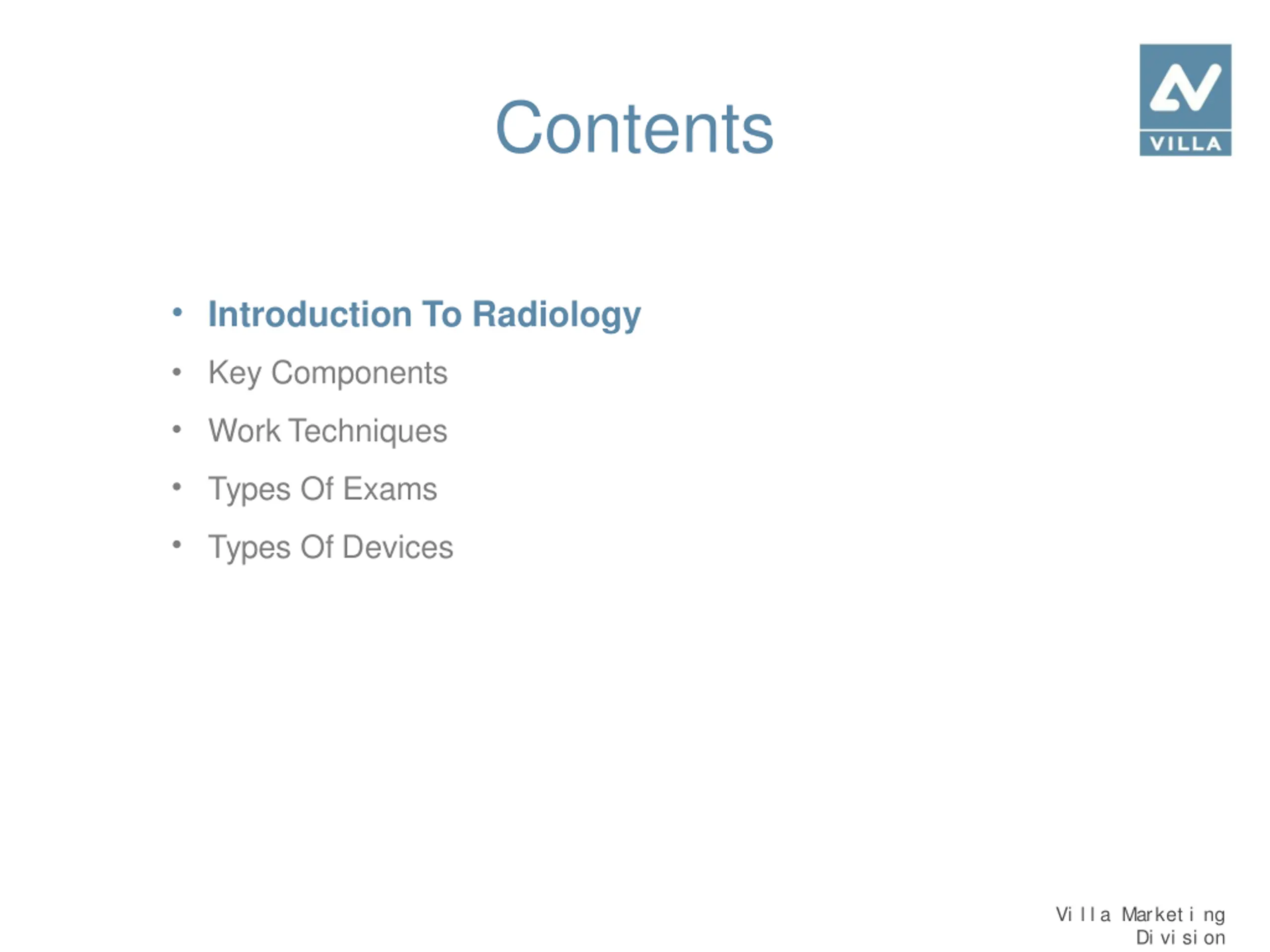 Contents Introduction To Radiology Key Components Work Techniques Types Of Exams Types Of Devices Vi l l a Mar ket i ng Di vi si on