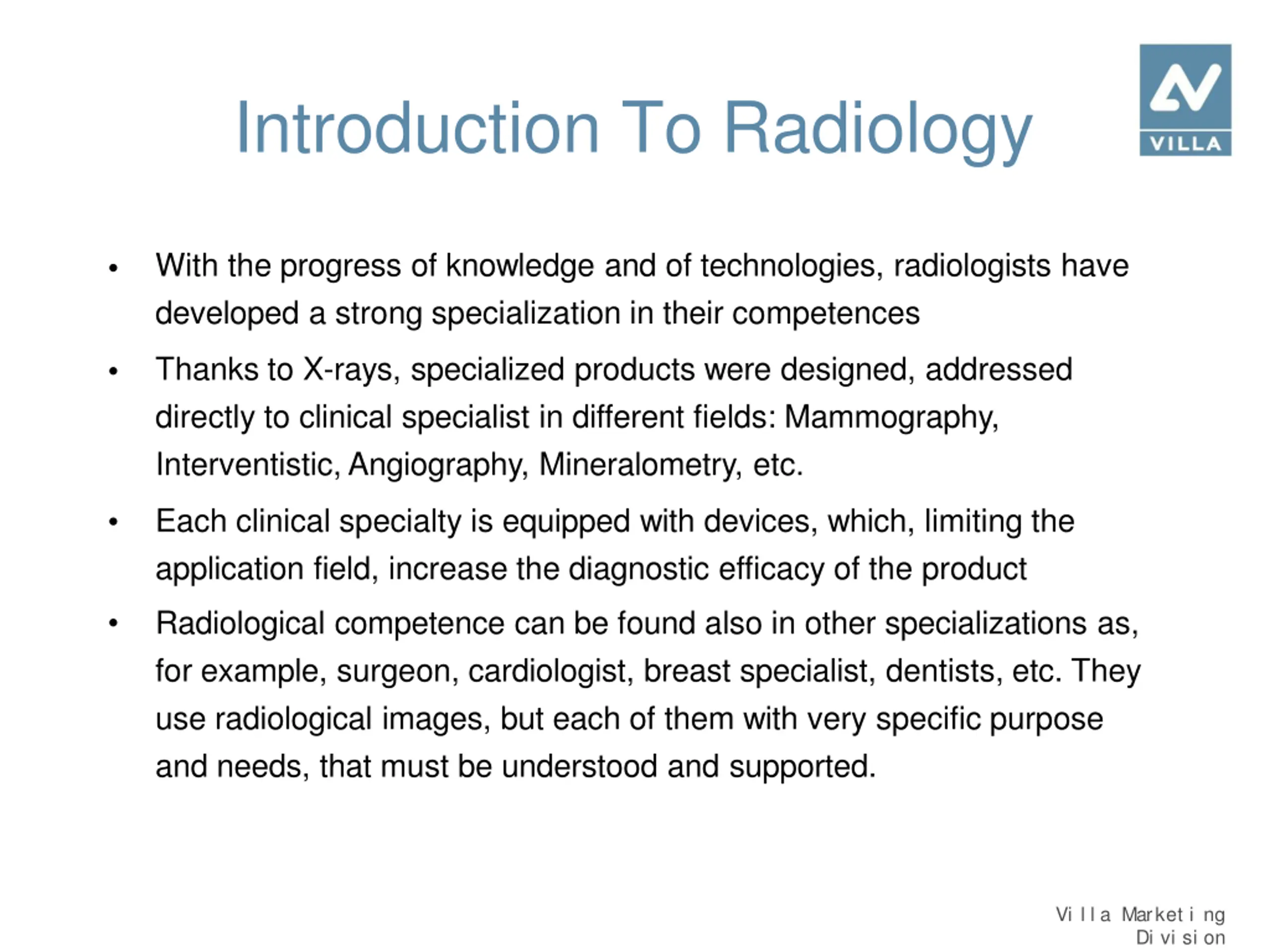 Introduction To Radiology With the progress of knowledge and of technologies, radiologists have developed a strong specialization in their competences Thanks to X-rays, specialized products were designed, addressed directly to clinical specialist in different fields: Mammography, Interventistic, Angiography, Mineralometry, etc. Each clinical specialty is equipped with devices, which, limiting the application field, increase the diagnostic efficacy of the product Radiological competence can be found also in other specializations as, for example, surgeon, cardiologist, breast specialist, dentists, etc. They use radiological images, but each of them with very specific purpose and needs, that must be understood and supported. Vi l l a Mar ket i ng Di vi si on
