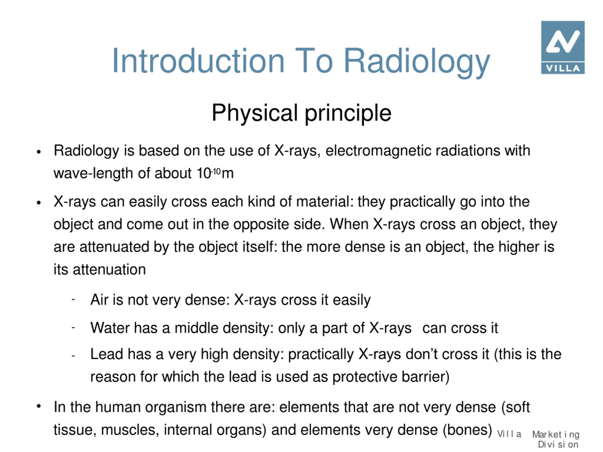 Introduction To Radiology Physical principle Radiology is based on the use of X-rays, electromagnetic radiations with wave-length of about 10-10 m X-rays can easily cross each kind of material: they practically go into the object and come out in the opposite side. When X-rays cross an object, they are attenuated by the object itself: the more dense is an object, the higher is its attenuation Air is not very dense: X-rays cross it easily - Water has a middle density: only a part of X-rays can cross it - Lead has a very high density: practically X-rays don t cross it (this is the reason for which the lead is used as protective barrier) - In the human organism there are: elements that are not very dense (soft tissue, muscles, internal organs) and elements very dense (bones) Vi l l a Mar ket i ng Di vi si on
