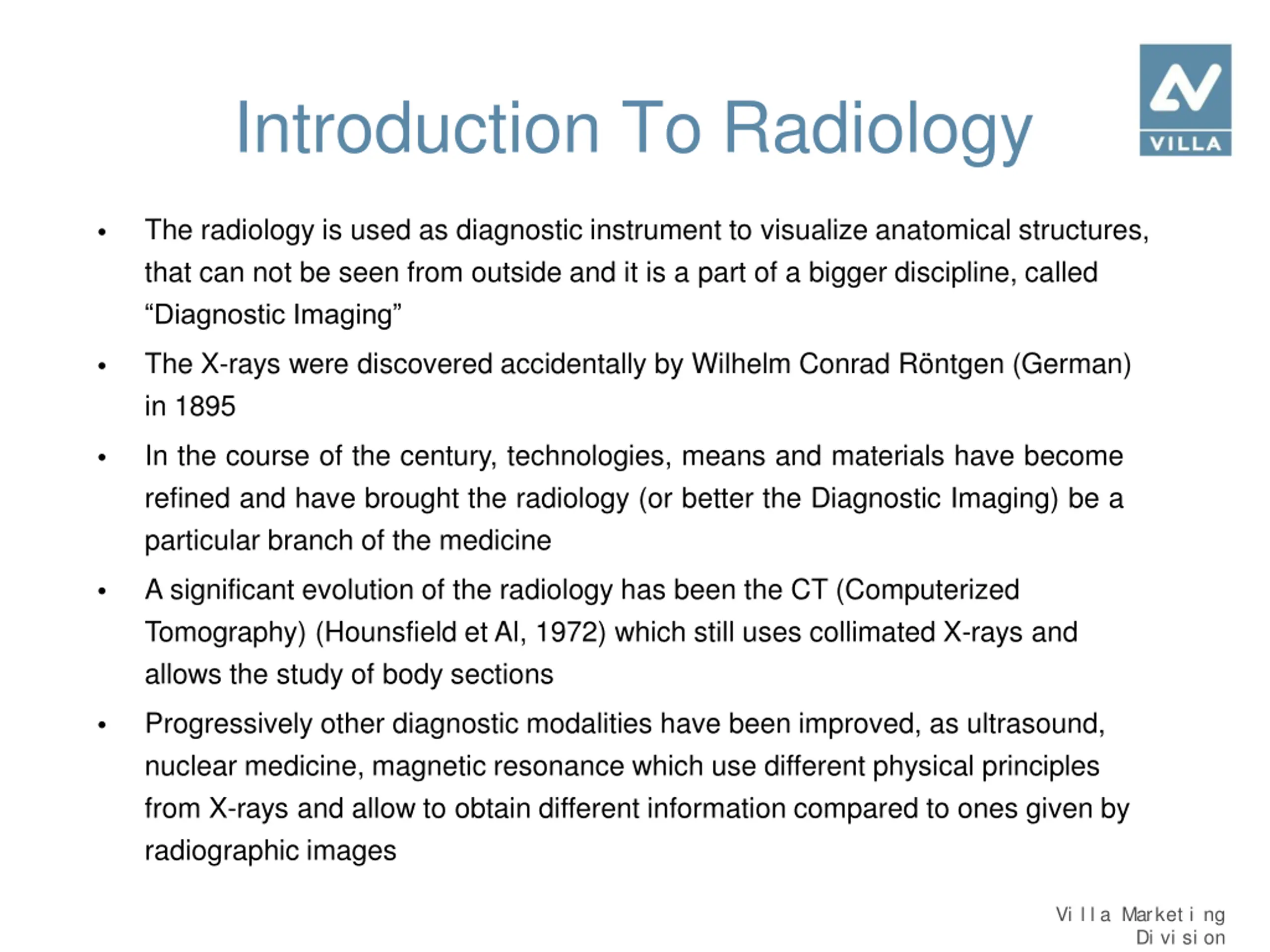 Introduction To Radiology The radiology is used as diagnostic instrument to visualize anatomical structures, that can not be seen from outside and it is a part of a bigger discipline, called DiagnosticImaging The X-rays were discovered accidentally by Wilhelm Conrad R ntgen (German) in 1895 In the course of the century, technologies, means and materials have become refined and have brought the radiology (or better the Diagnostic Imaging) be a particular branch of the medicine A significant evolution of the radiology has been the CT (Computerized Tomography) (Hounsfield et Al, 1972) which still uses collimated X-rays and allows the study of body sections Progressively other diagnostic modalities have been improved, as ultrasound, nuclear medicine, magnetic resonance which use different physical principles from X-rays and allow to obtain different information compared to ones given by radiographic images Vi l l a Mar ket i ng Di vi si on