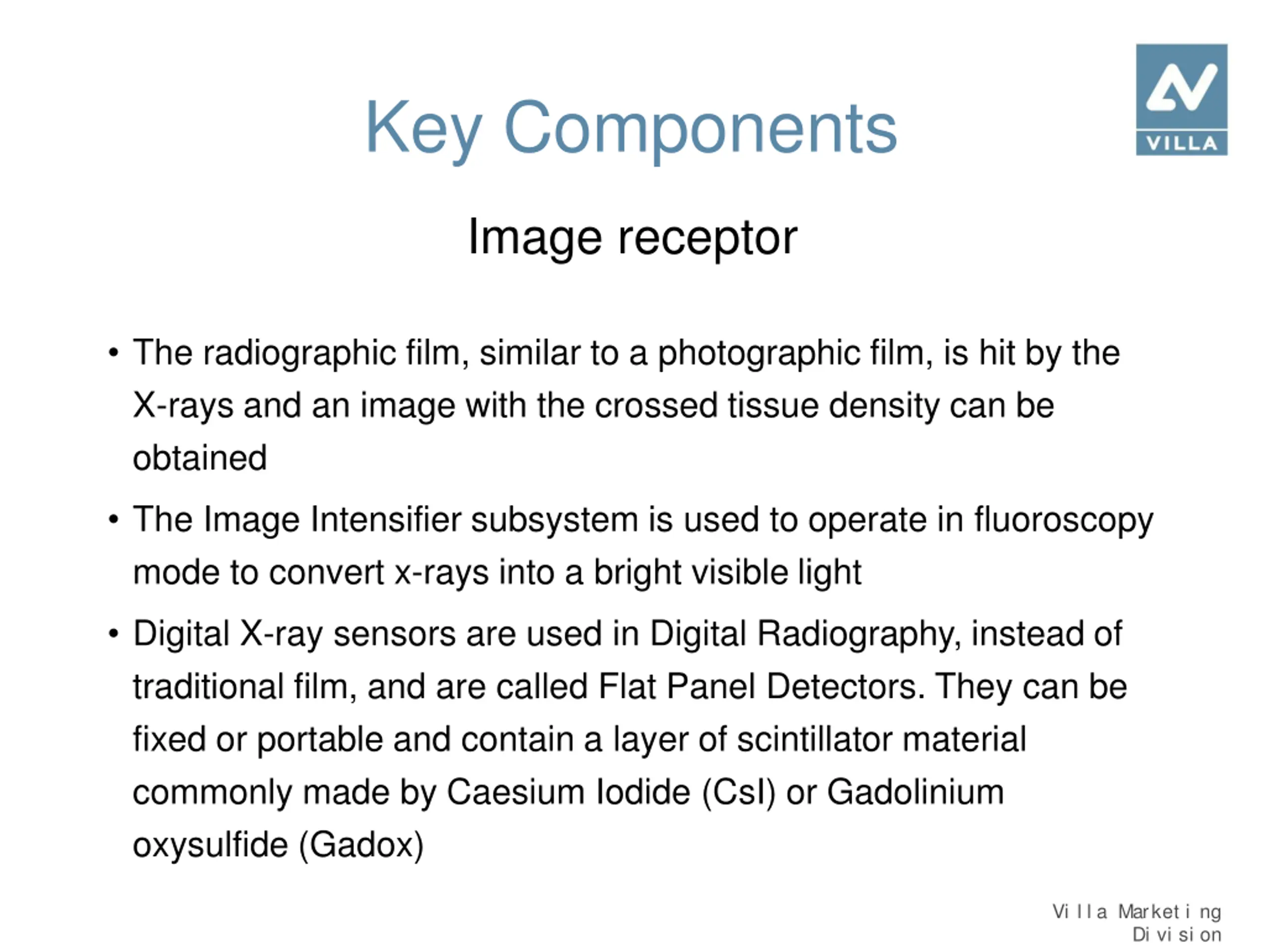 Key Components Image receptor The radiographic film, similar to a photographic film, is hit by the X-rays and an image with the crossed tissue density can be obtained The Image Intensifier subsystem is used to operate in fluoroscopy mode to convert x-rays into a bright visible light Digital X-ray sensors are used in Digital Radiography, instead of traditional film, and are called Flat Panel Detectors. They can be fixed or portable and contain a layer of scintillator material commonly made by Caesium Iodide (CsI) or Gadolinium oxysulfide (Gadox) Vi l l a Mar ket i ng Di vi si on