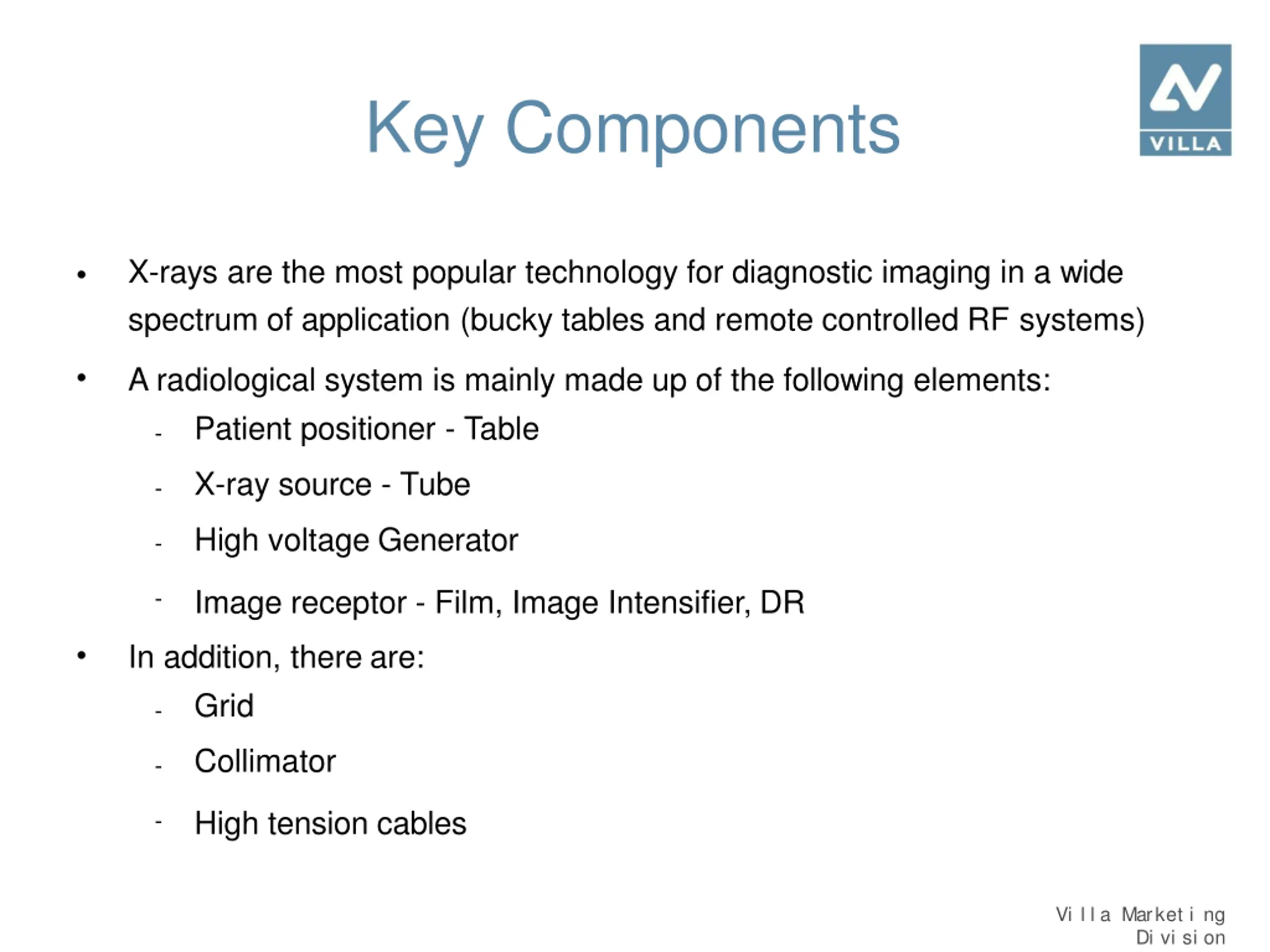 Key Components X-rays are the most popular technology for diagnostic imaging in a wide spectrum of application (bucky tables and remote controlled RF systems) A radiological system is mainly made up of the following elements: Patient positioner - Table - X-ray source - Tube - High voltage Generator - Image receptor - Film, Image Intensifier, DR - In addition, there are: Grid - Collimator - High tension cables - Vi l l a Mar ket i ng Di vi si on