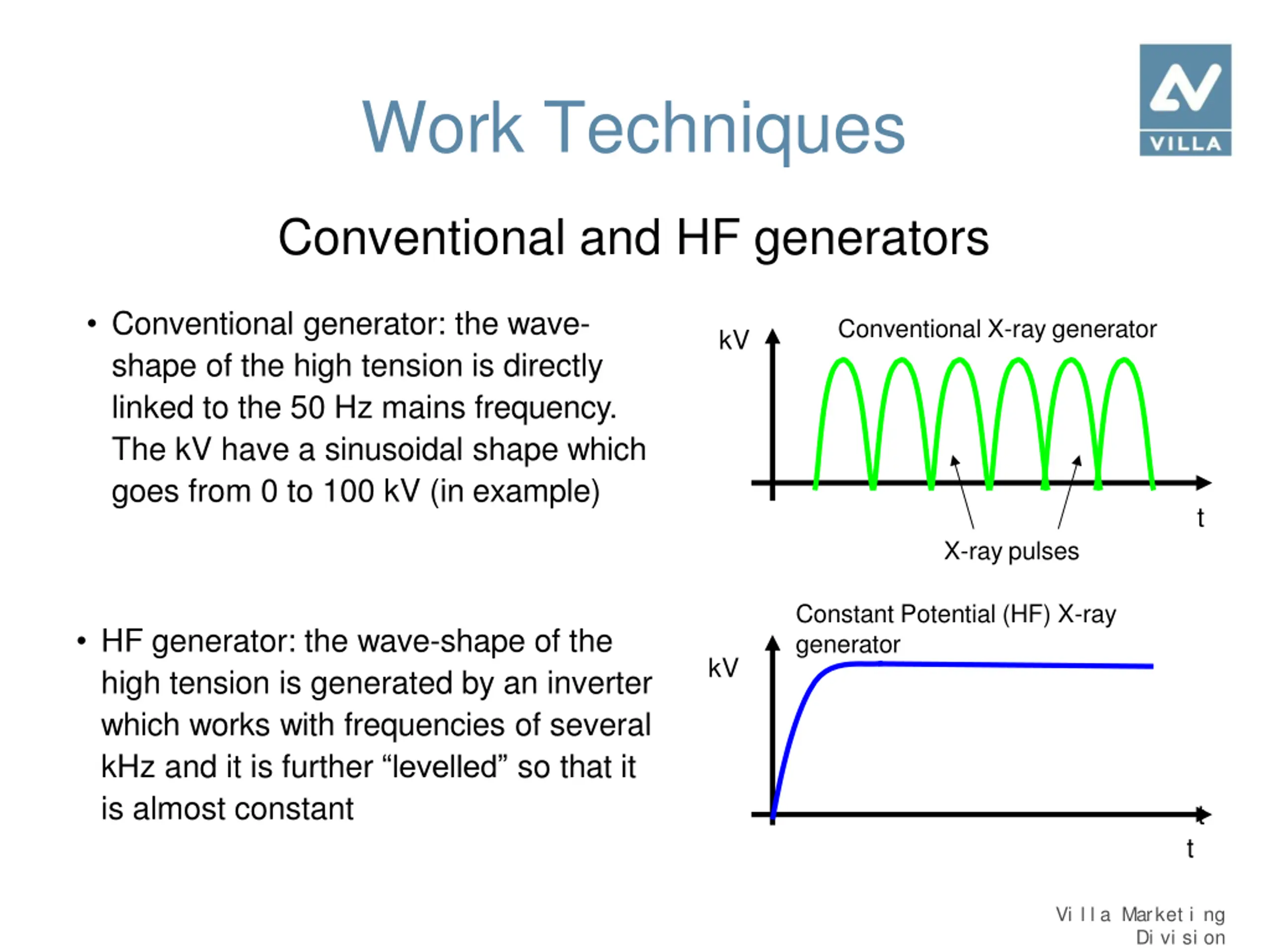 Work Techniques Conventional and HF generators Conventional generator: the wave- shape of the high tension is directly linked to the 50 Hz mains frequency. The kV have a sinusoidal shape which goes from 0 to 100 kV (in example) Conventional X-ray generator kV t X-ray pulses Constant Potential (HF) X-ray generator HF generator: the wave-shape of the high tension is generated by an inverter which works with frequencies of several kHz and it is further levelled so that it is almost constant kV t t Vi l l a Mar ket i ng Di vi si on