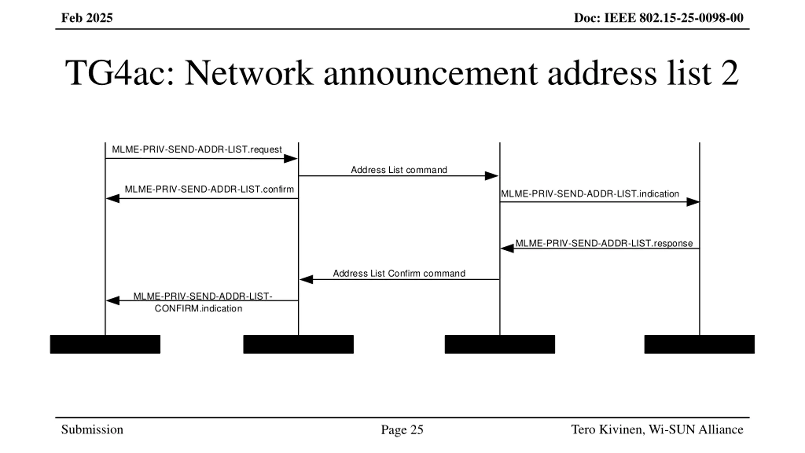 Device higher layer Device MAC Device MAC Device higher layer MLME-PRIV-NET-VERIFIER- GENERATE.request MLME-PRIV-NET-VERIFIER- GENERATE.confirm Beacon frame containing Net Announcement IE MLME-BEACON-NOTIFY.indication Feb 2025 Doc: IEEE 802.15-25-0098-00 MLME-PRIV-NET-VERIFIER- VERIFY.request TG4ac: Network announcement address list 1 MLME-PRIV-NET-VERIFIER- VERIFY.confirm MLME-PRIV-REQ-ADDR.request Request Addresses command MLME-PRIV-REQ-ADDR.confirm MLME-PRIV-REQ-ADDR.indication MLME-PRIV-SEND-ADDR-LIST.request Address List command MLME-PRIV-SEND-ADDR-LIST.confirm MLME-PRIV-SEND-ADDR-LIST.indication MLME-PRIV-SEND-ADDR-LIST.response Address List Confirm command MLME-PRIV-SEND-ADDR-LIST- CONFIRM.indication MLME-PRIV-SEND-ADDR-LIST.request Address List command MLME-PRIV-SEND-ADDR-LIST.confirm MLME-PRIV-SEND-ADDR-LIST.indication Submission Tero Kivinen, Wi-SUN Alliance Page 24 MLME-PRIV-SEND-ADDR-LIST.response Address List Confirm command MLME-PRIV-SEND-ADDR-LIST- CONFIRM.indication