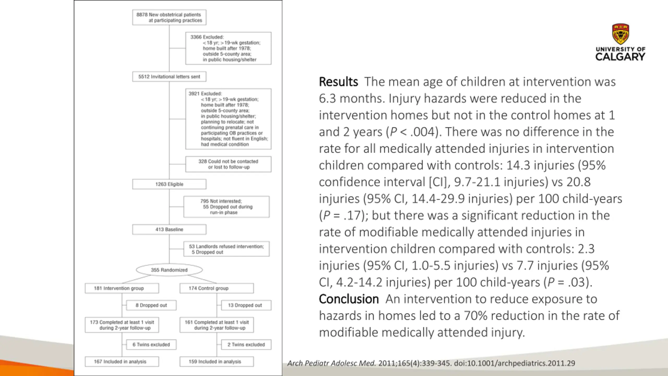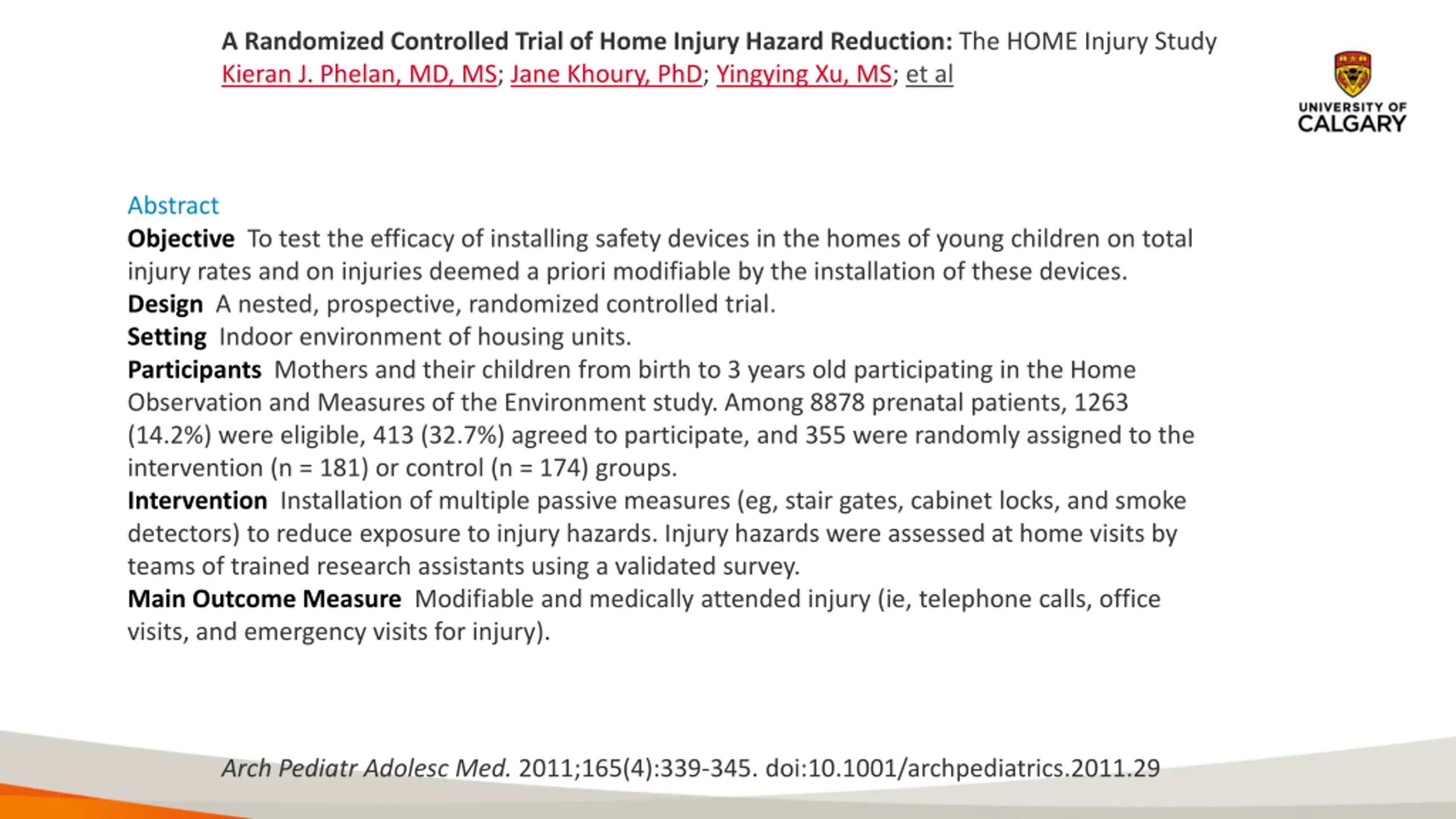 A Randomized Controlled Trial of Home Injury Hazard Reduction: The HOME Injury Study Kieran J. Phelan, MD, MS; Jane Khoury, PhD; Yingying Xu, MS; et al Abstract Objective To test the efficacy of installing safety devices in the homes of young children on total injury rates and on injuries deemed a priori modifiable by the installation of these devices. Design A nested, prospective, randomized controlled trial. Setting Indoor environment of housing units. Participants Mothers and their children from birth to 3 years old participating in the Home Observation and Measures of the Environment study. Among 8878 prenatal patients, 1263 (14.2%) were eligible, 413 (32.7%) agreed to participate, and 355 were randomly assigned to the intervention (n = 181) or control (n = 174) groups. Intervention Installation of multiple passive measures (eg, stair gates, cabinet locks, and smoke detectors) to reduce exposure to injury hazards. Injury hazards were assessed at home visits by teams of trained research assistants using a validated survey. Main Outcome Measure Modifiable and medically attended injury (ie, telephone calls, office visits, and emergency visits for injury). Arch Pediatr Adolesc Med. 2011;165(4):339-345. doi:10.1001/archpediatrics.2011.29