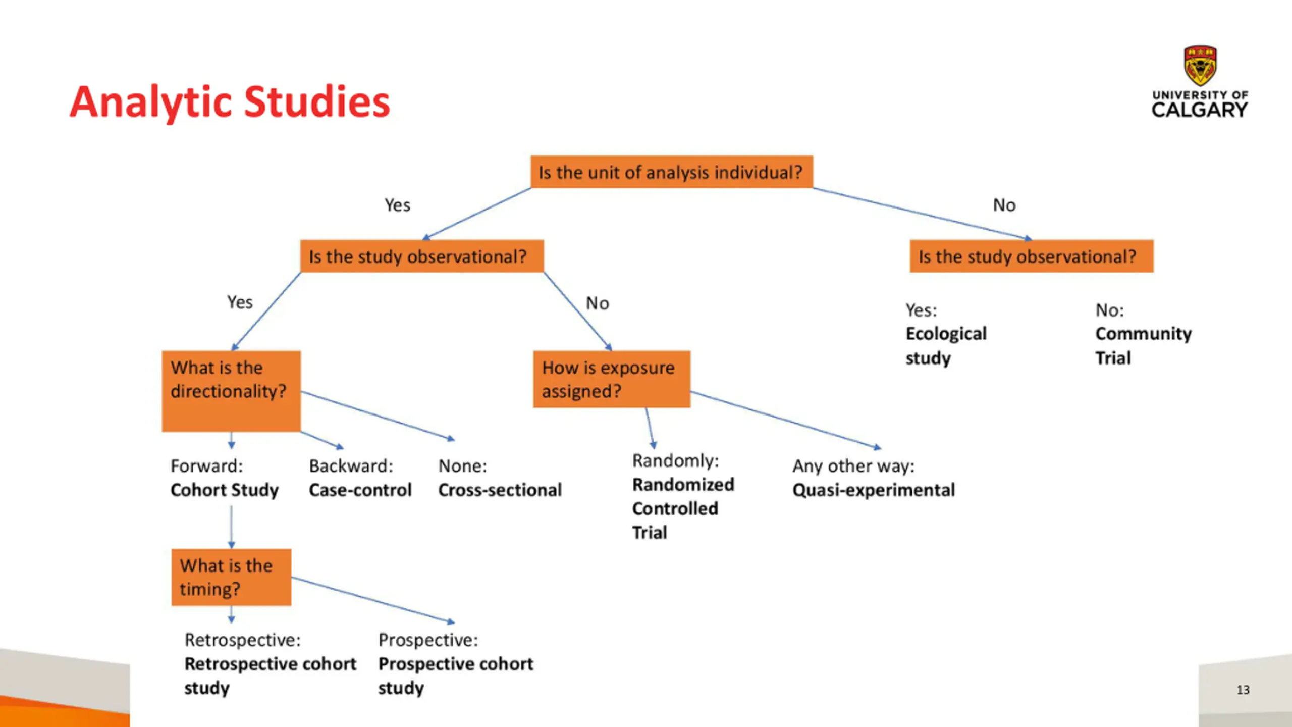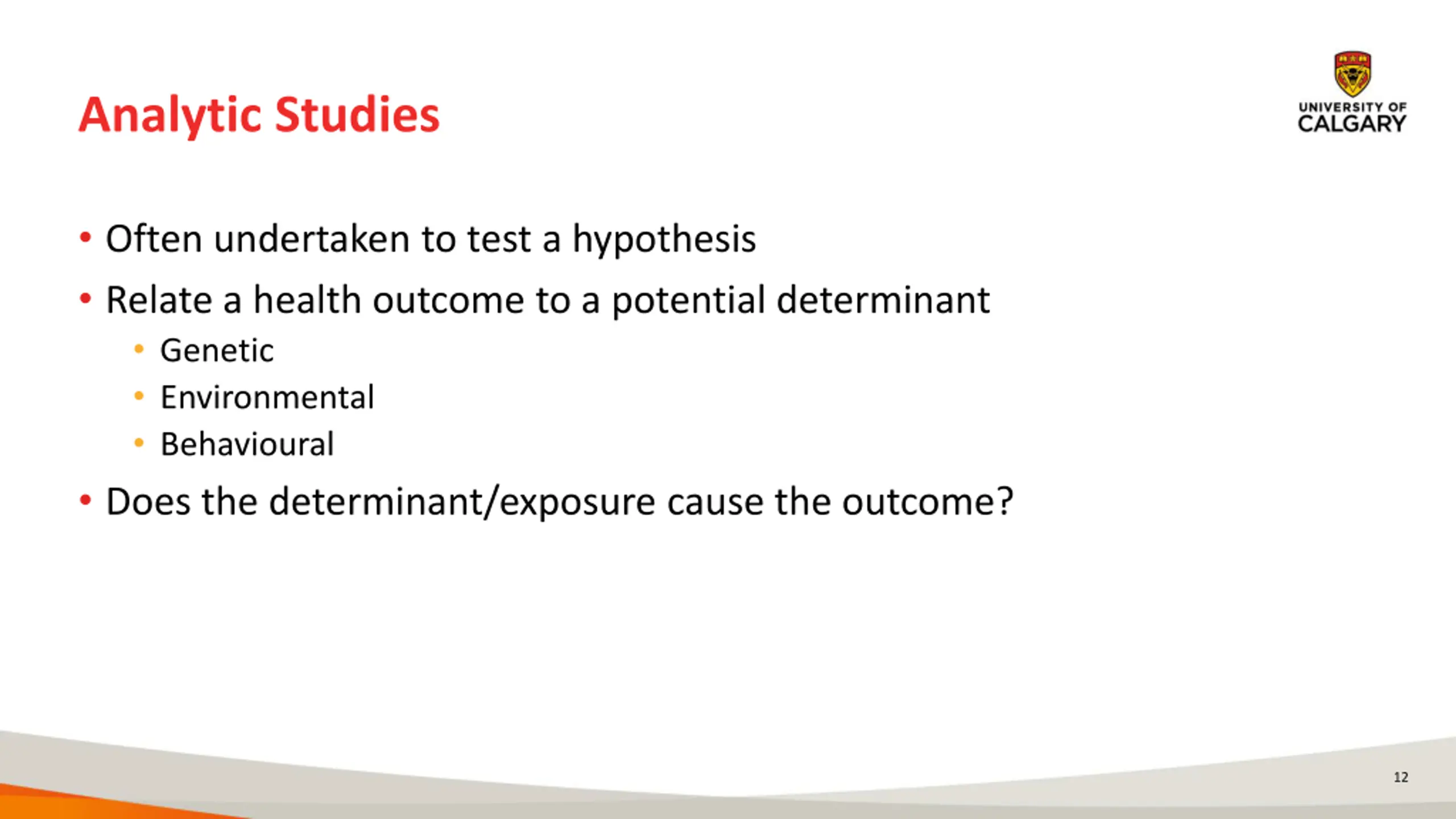 Analytic Studies Often undertaken to test a hypothesis Relate a health outcome to a potential determinant Genetic Environmental Behavioural Does the determinant/exposure cause the outcome? 12