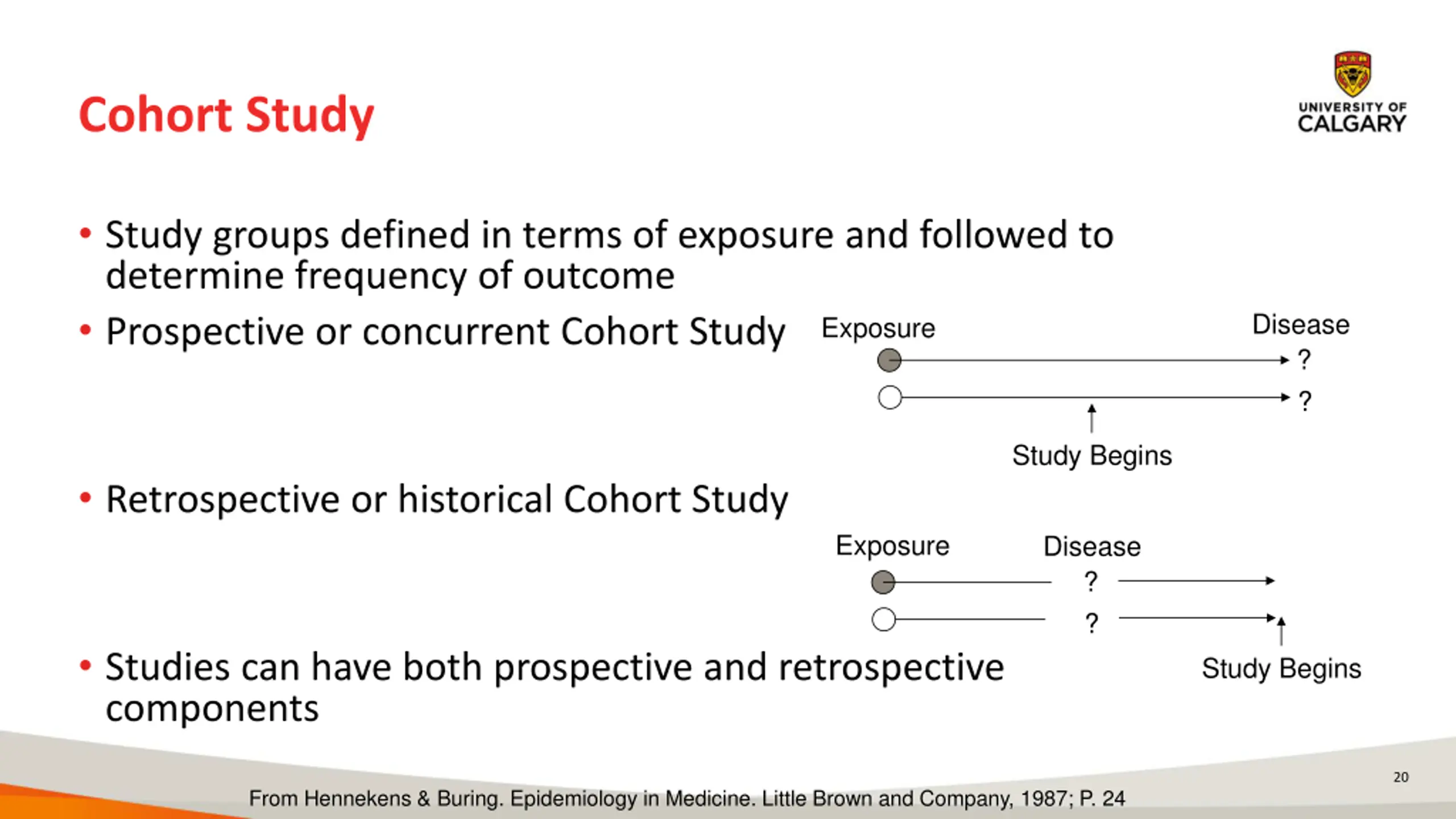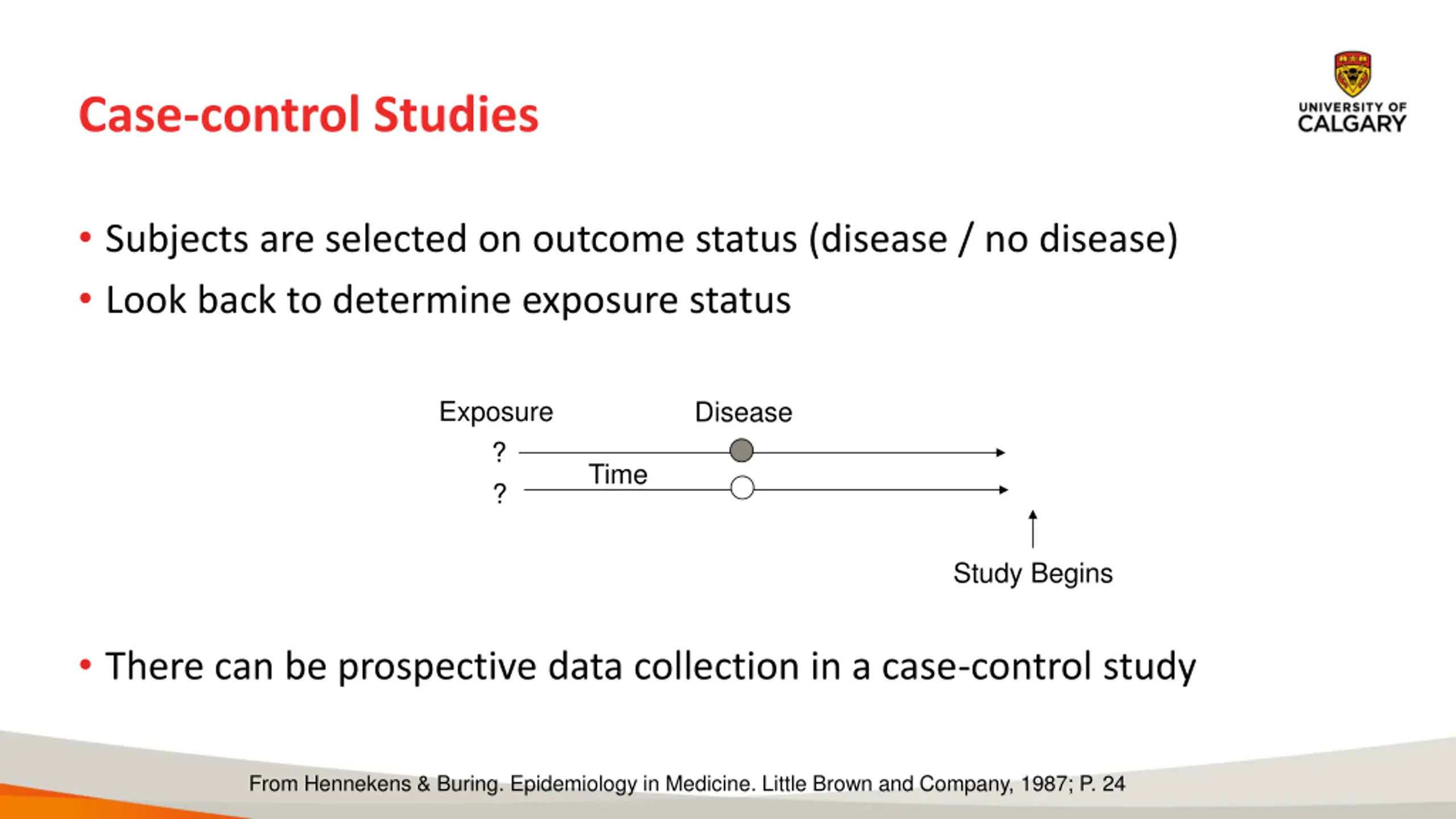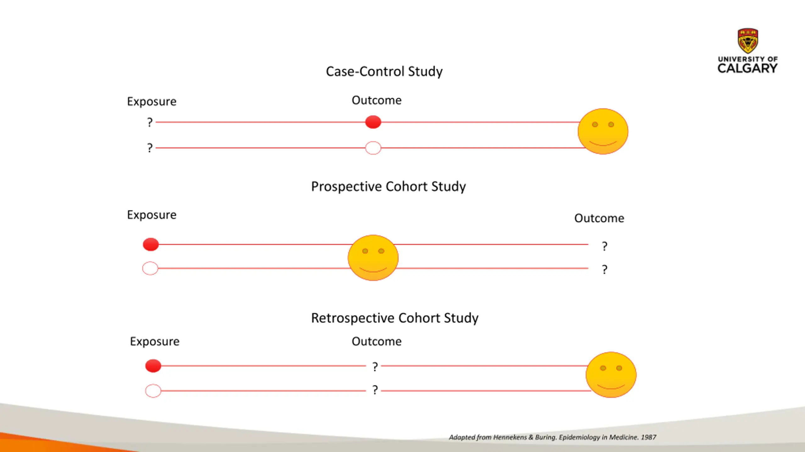 Case-Control Study Outcome Exposure ? ? Prospective Cohort Study Exposure Outcome ? ? Retrospective Cohort Study Exposure Outcome ? ? Adapted from Hennekens & Buring. Epidemiology in Medicine. 1987