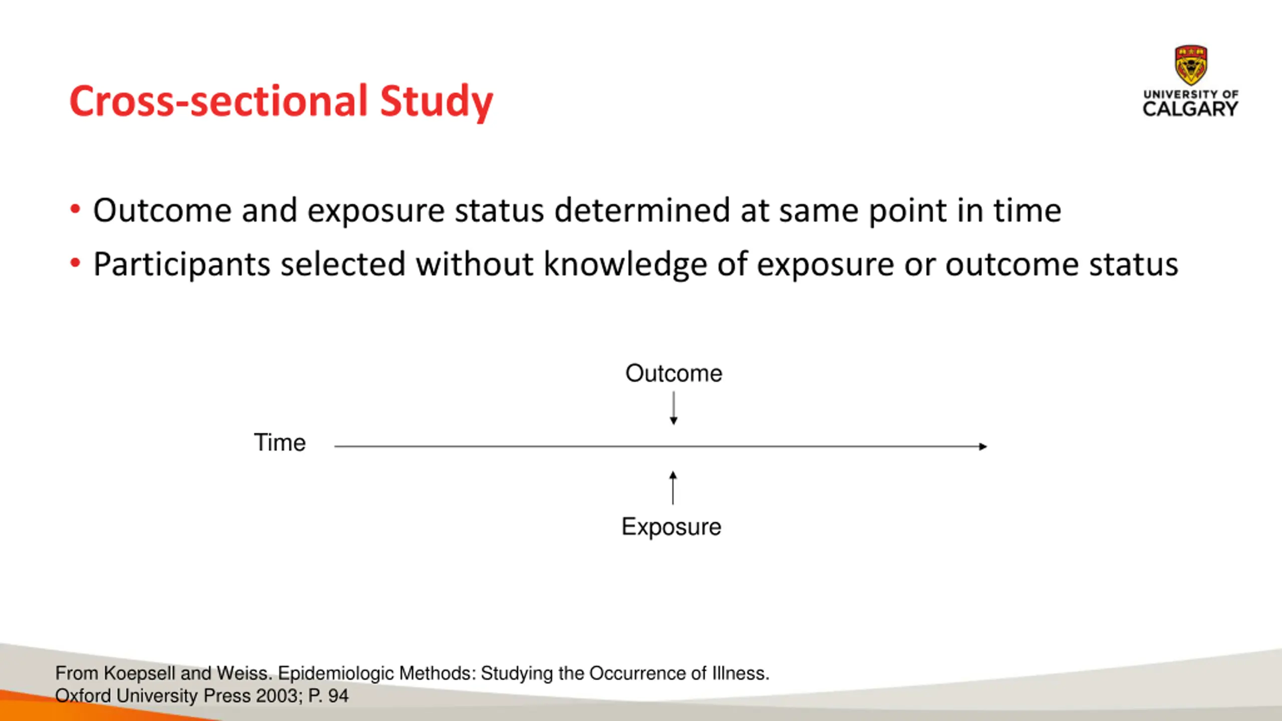 Cross-sectional Study Outcome and exposure status determined at same point in time Participants selected without knowledge of exposure or outcome status Outcome Time Exposure From Koepsell and Weiss. Epidemiologic Methods: Studying the Occurrence of Illness. Oxford University Press 2003; P. 94