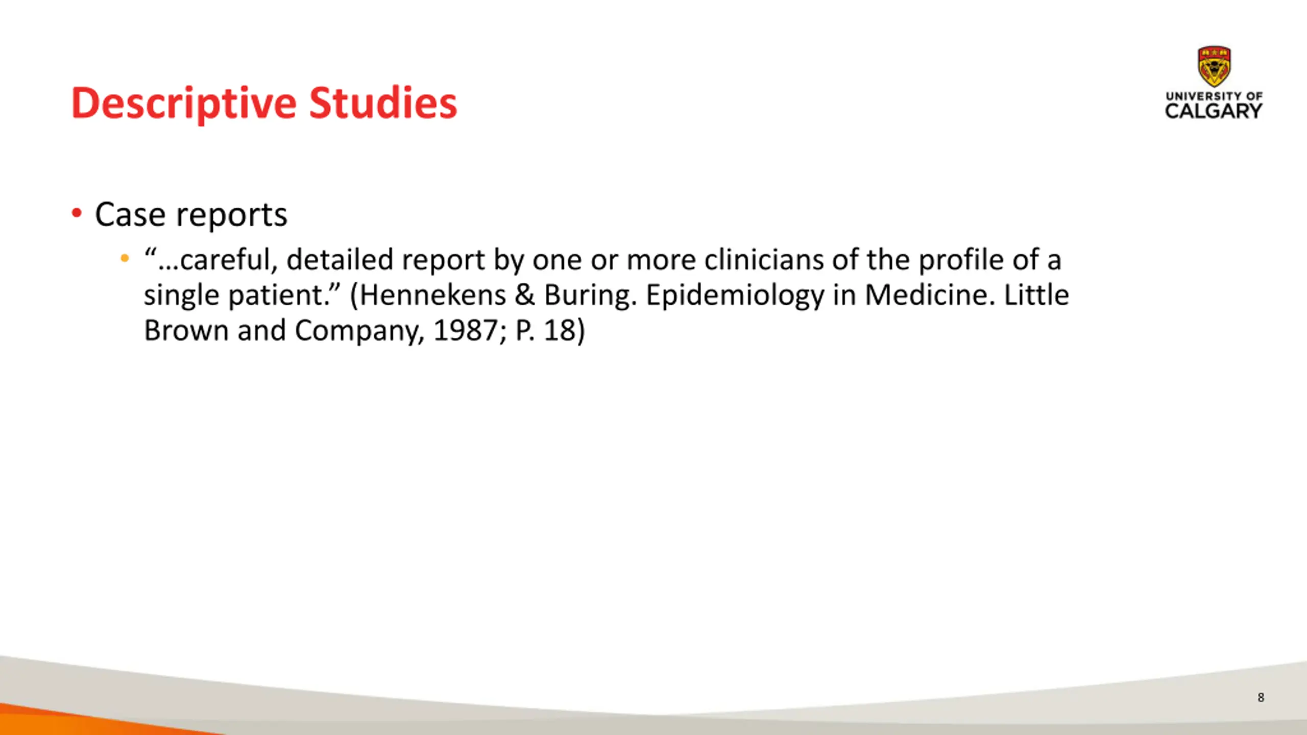 Descriptive Studies Case reports careful, detailed report by one or more clinicians of the profile of a single patient. (Hennekens & Buring. Epidemiology in Medicine. Little Brown and Company, 1987; P. 18) 8