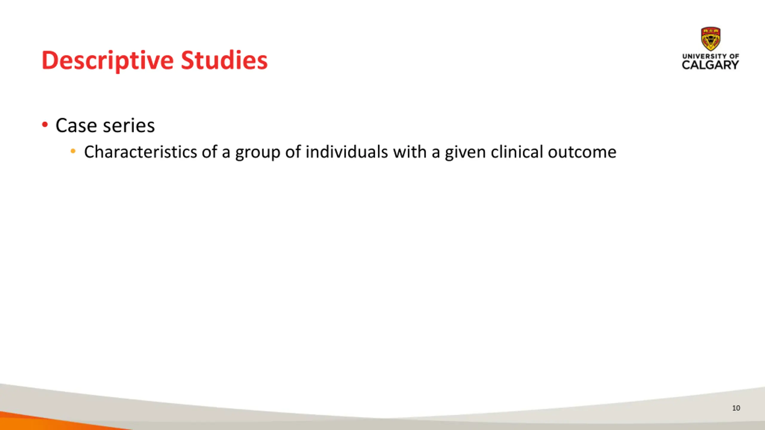 Descriptive Studies Case series Characteristics of a group of individuals with a given clinical outcome 10
