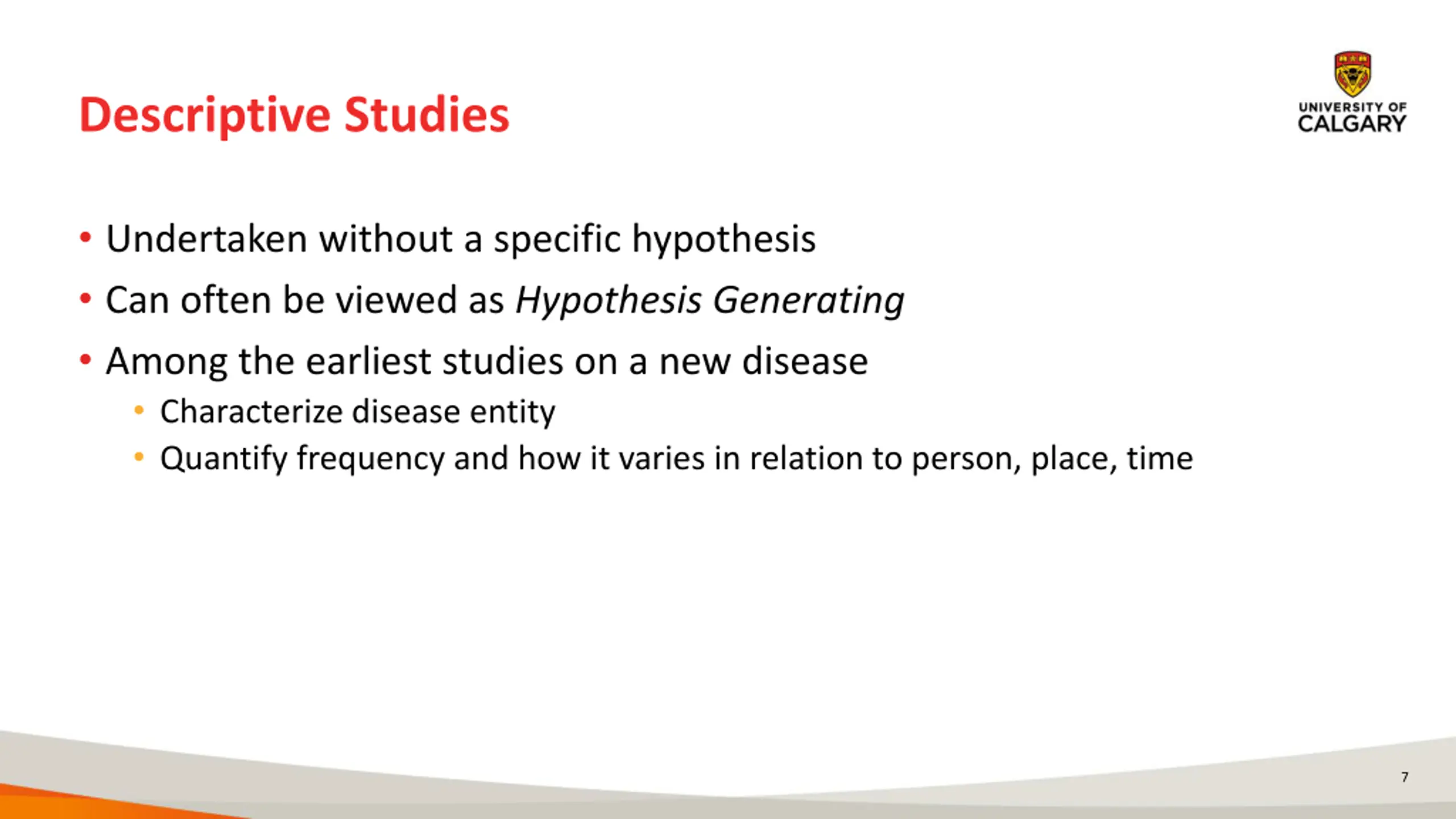 Descriptive Studies Undertaken without a specific hypothesis Can often be viewed as Hypothesis Generating Among the earliest studies on a new disease Characterize disease entity Quantify frequency and how it varies in relation to person, place, time 7