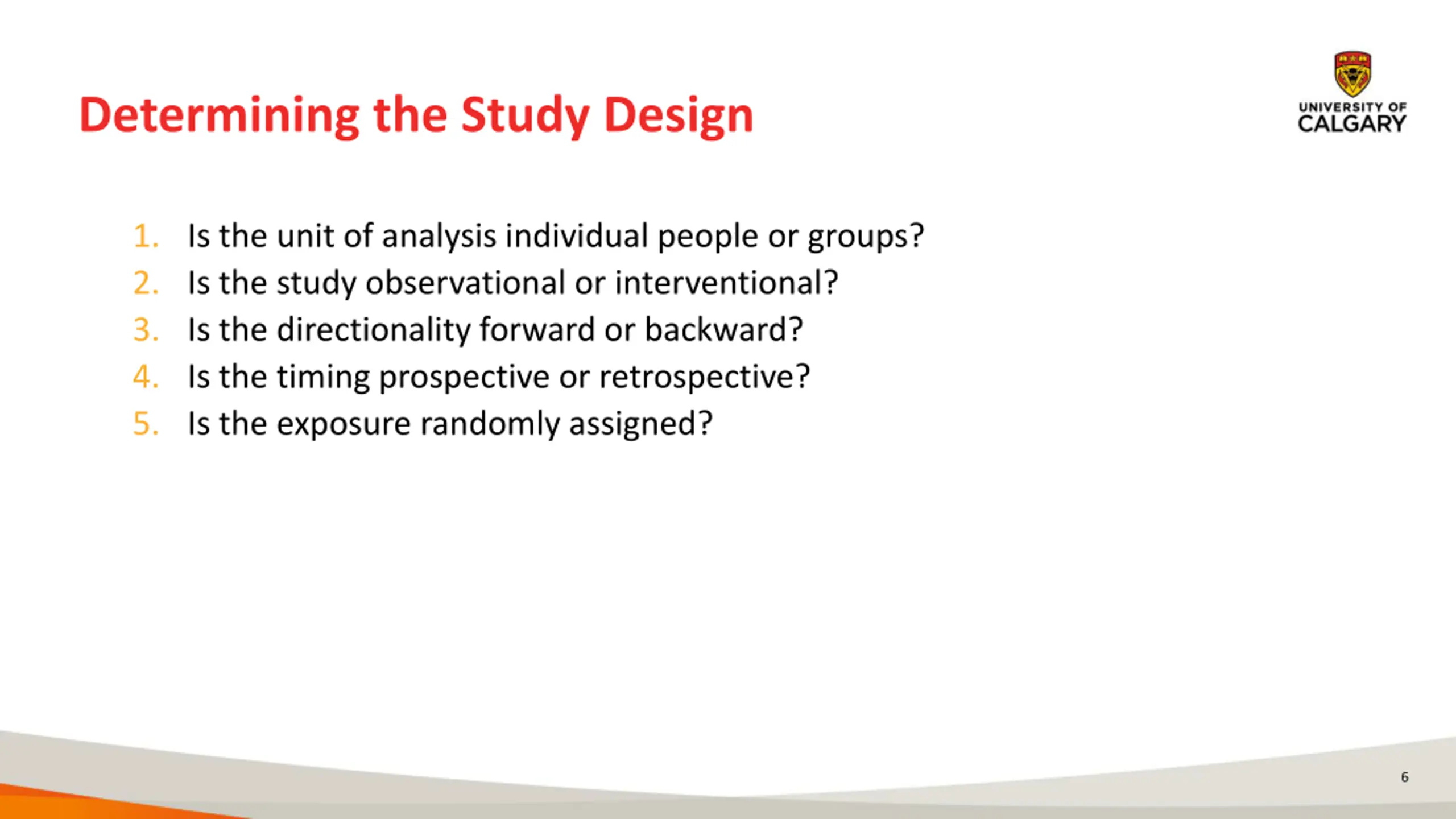 Determining the Study Design 1. Is the unit of analysis individual people or groups? 2. Is the study observational or interventional? 3. Is the directionality forward or backward? 4. Is the timing prospective or retrospective? 5. Is the exposure randomly assigned? 6
