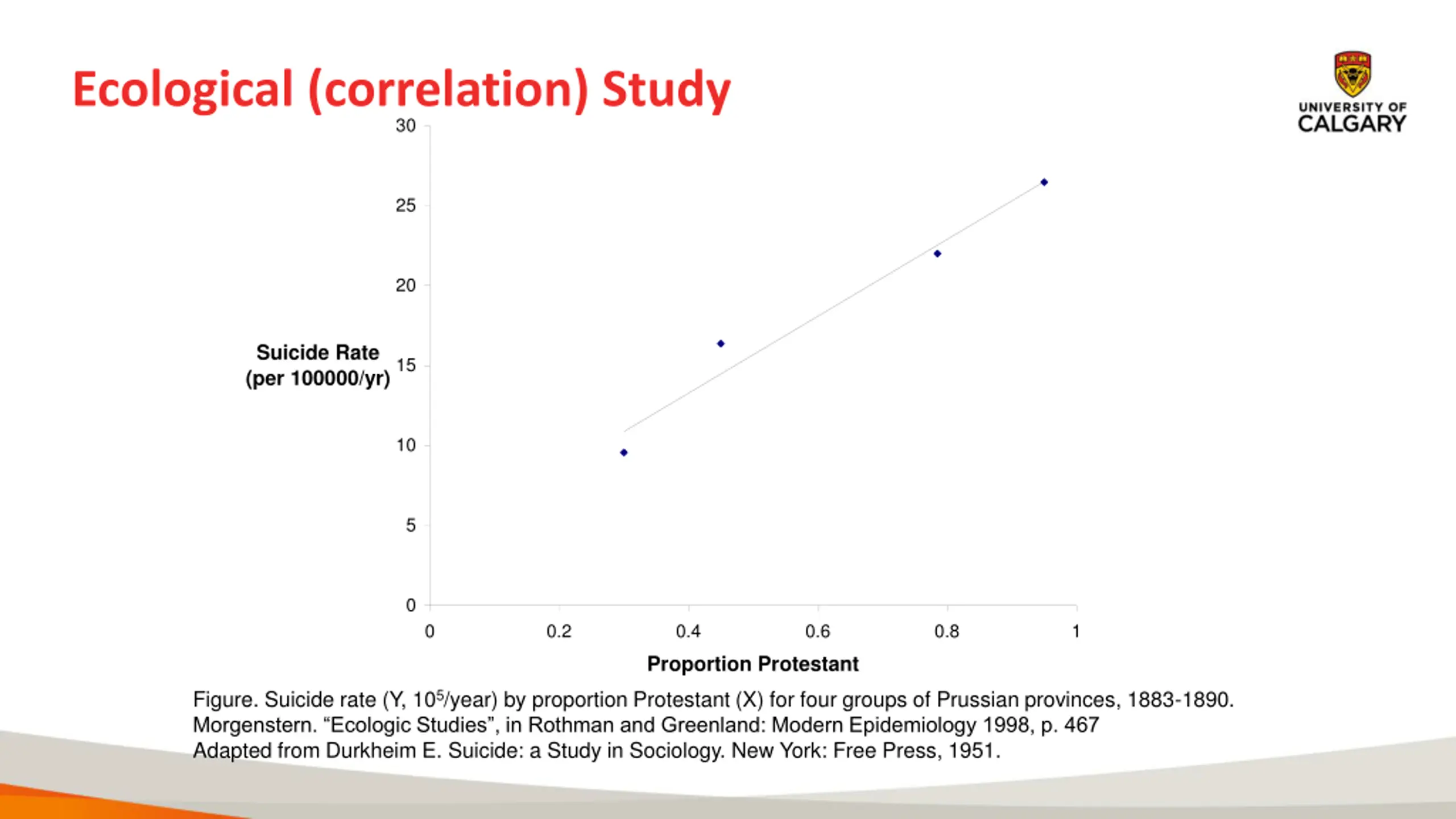 Ecological (correlation) Study 30 25 20 Suicide Rate (per 100000/yr) 15 10 5 0 0 0.2 0.4 0.6 0.8 1 Proportion Protestant Figure. Suicide rate (Y, 105/year) by proportion Protestant (X) for four groups of Prussian provinces, 1883-1890. Morgenstern. Ecologic Studies , in Rothman and Greenland: Modern Epidemiology 1998, p. 467 Adapted from Durkheim E. Suicide: a Study in Sociology. New York: Free Press, 1951.