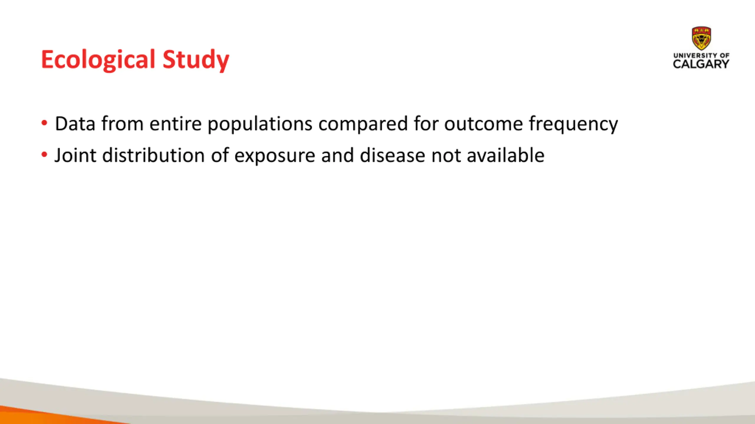 Ecological Study Data from entire populations compared for outcome frequency Joint distribution of exposure and disease not available