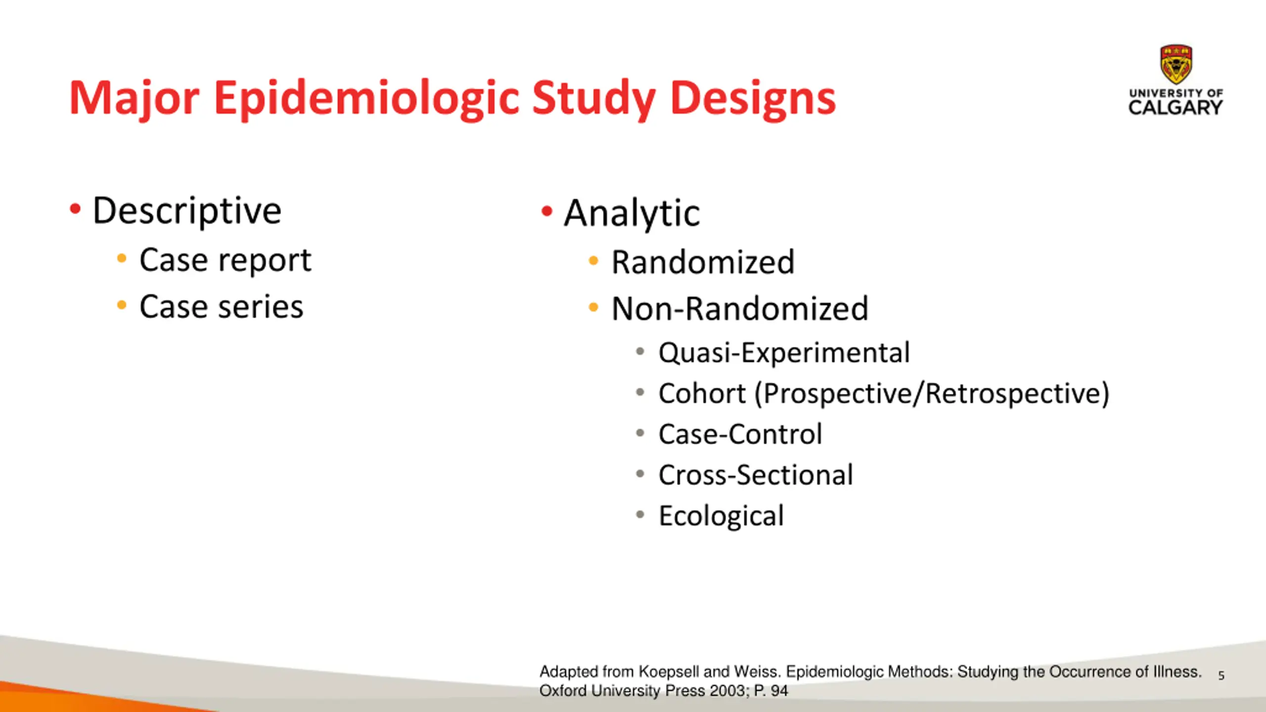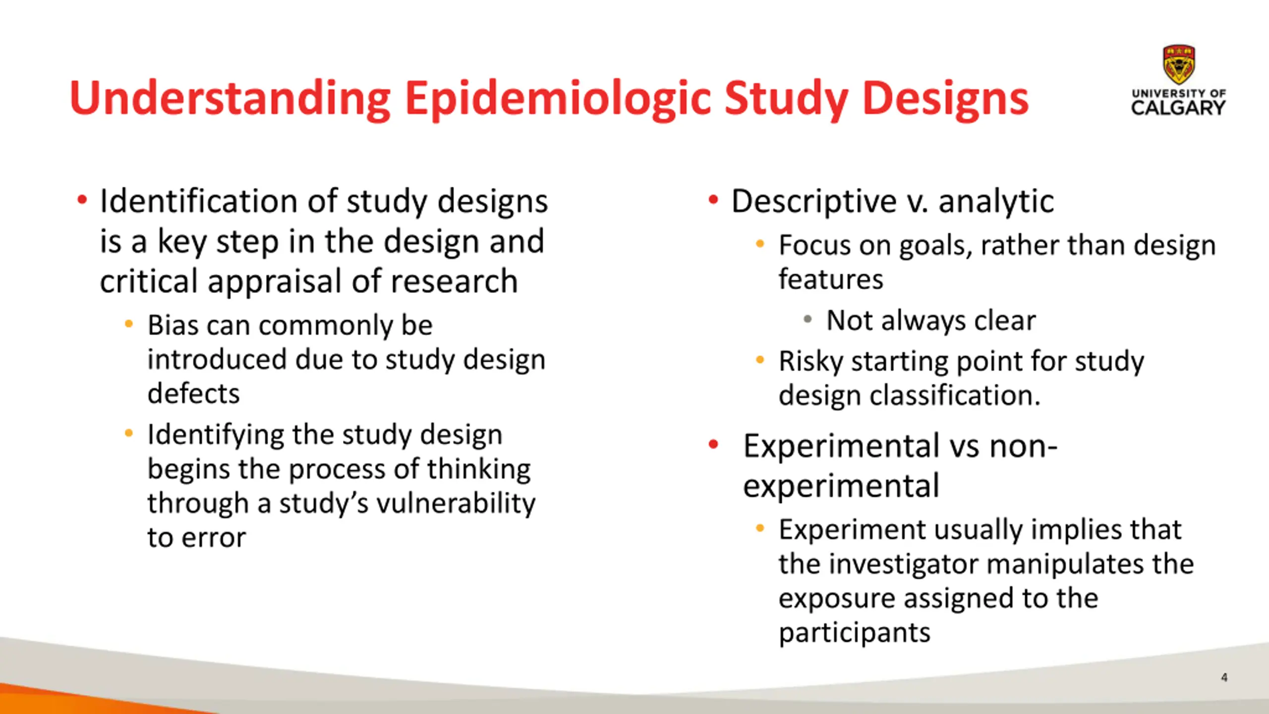 Understanding Epidemiologic Study Designs Identification of study designs is a key step in the design and critical appraisal of research Bias can commonly be introduced due to study design defects Identifying the study design begins the process of thinking through a study s vulnerability to error Descriptive v. analytic Focus on goals, rather than design features Not always clear Risky starting point for study design classification. Experimental vs non- experimental Experiment usually implies that the investigator manipulates the exposure assigned to the participants 4